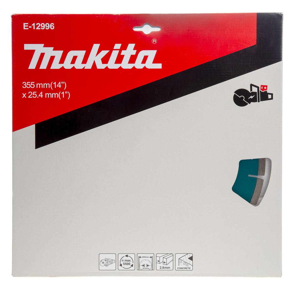 The Makita E-12996 is a 355mm diameter Segmented Diamond Cutting Wheel that fits the Makita CE001G Twin 40Vmax XGT Power Cutter. It has a maximum cutting depth of 50mm and is designed for cutting concrete.