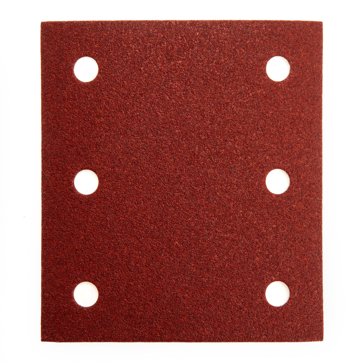 The Makita P-33118 is a Pack of 10 Hook and Loop Sanding Sheets with 6 holes, 1/4 Sheet in size and a 100 Grit rating. The grit size is determined by the number of holes per square inch required by a sieve designed to collect the grit. The smaller the number, the coarser the cut. A coated abrasive comprises 3 major components; abrasive grit, specific to the application; backing material to hold the abrasive and a bonding agent to glue the grit to backing. The quality of the materials and manufacturing method are critical factors in matching long life with fast cutting performance. Compatible with Makita BO4554, BO4555 and BO4561.