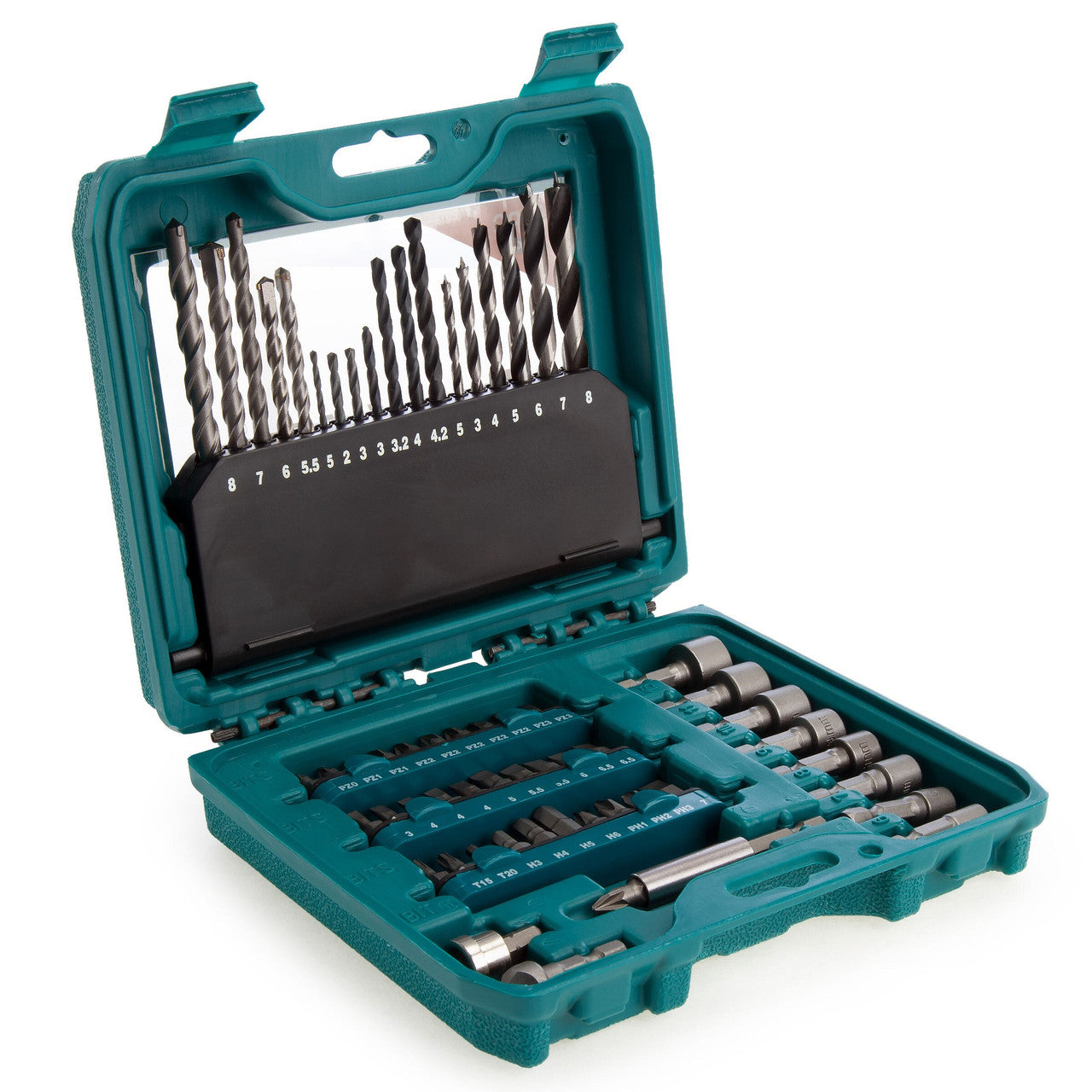 - 60 pieces of high-quality drill bits, screwdriver bits, and nut drivers