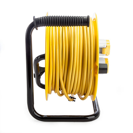 This 50 metre cable reel is ideal for site use, with two 110V plug sockets with safety covers and power indicator. The cable reel has a steel frame and it is fitted with flexible cable for easy reeling. The reel is strong and robust for safety and the yellow design is practical.