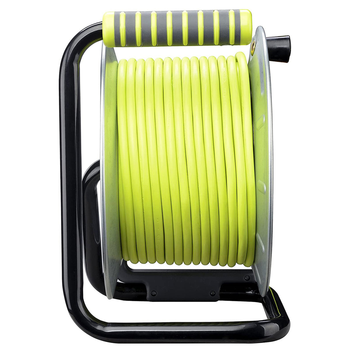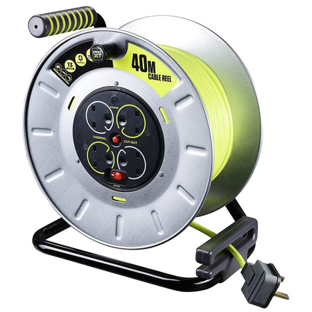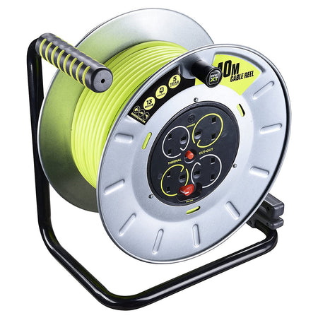 The Masterplug OTLU40134SL Heavy Duty Open Reel with its large metal drum has been designed and engineered for longevity. The steel drum provides reliable protection when in use, transported or stored. The robust design is perfect for the home, garden and industrial use. This open reel provides four sockets, power switch, LED indicator, highly visible green cable and has a built-in safety thermal cut-out for protection against overloading when fully reeled. The drum wind handle increases speed and control when winding in long lengths of cable from ground level or when mounted on an anchor point.