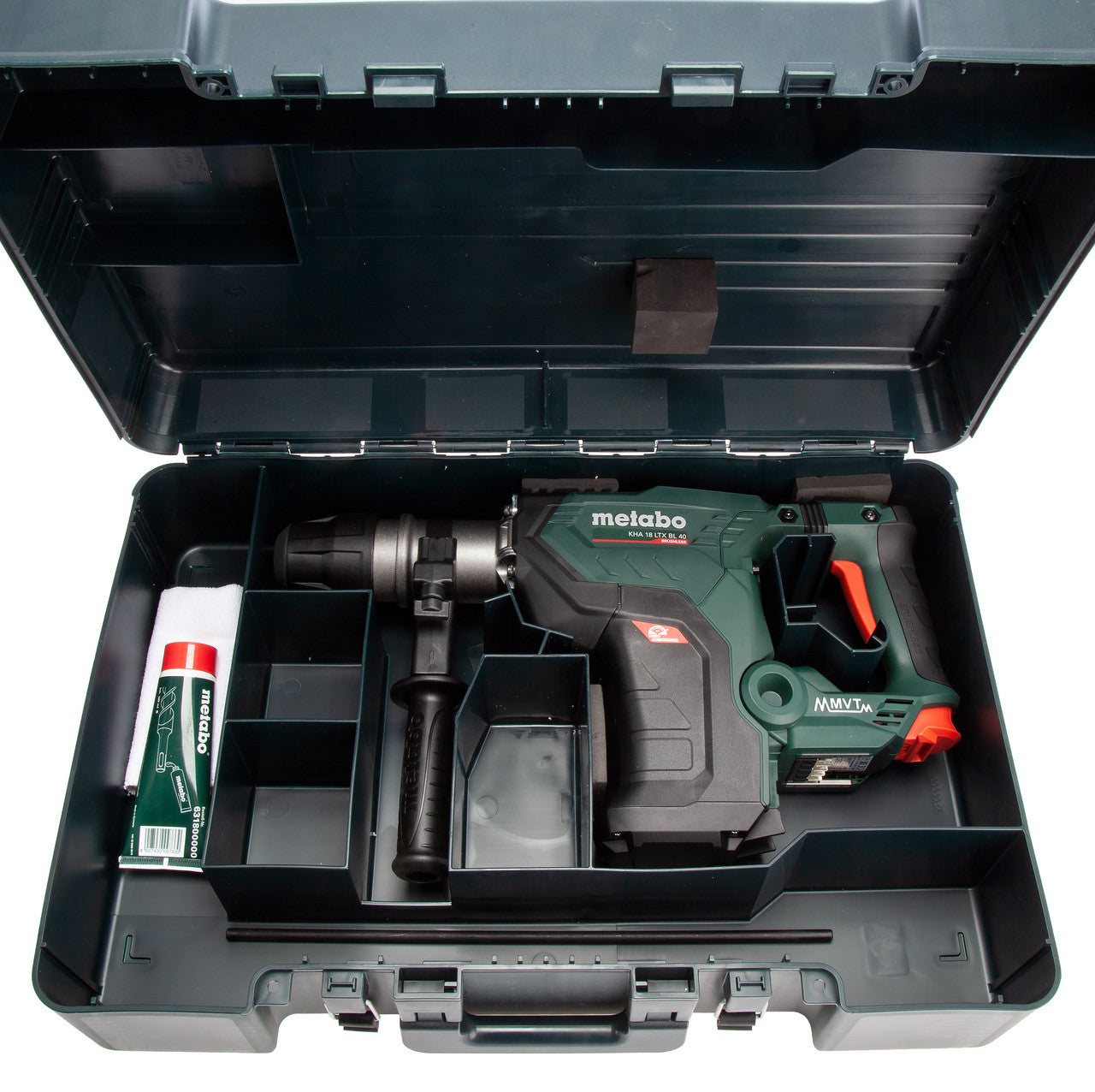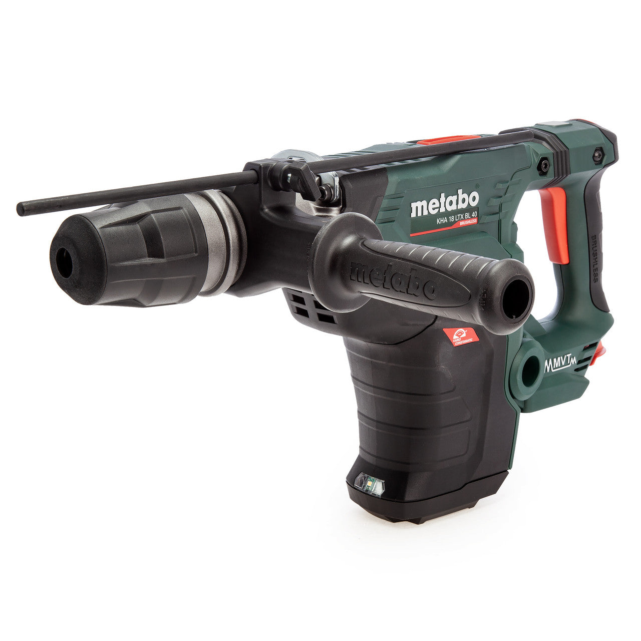 The Metabo KHA 18 LTX BL 40 is a Cordless SDS Max hammer Drill with 2 functions: hammer drilling and chiselling. The machine gives a powerful performance anywhere thanks to the Brushless Motor returning 8.6 Joules of impact energy at a rate of 3200 blows per minute. Fitted with Metabo VibraTech (MVT) to cushion the user from harmful vibration, the hammer drill can be operated for extended periods without fatigue. Sold as a Body Only version in a Carry Case without battery or charger.