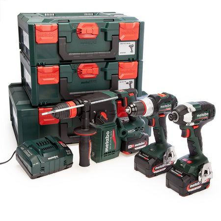 The Metabo UK685200003 is a Cordless 18V Set of 3 Tools consisting of the KH 18 LTX BL 24 Q (601714840) Cordless Hammer, SB 18 LT BL (602316840) Cordless Hammer Drill, SSD 18 LT 200 BL (602397840) Cordless Impact Driver, 3 x 5.2Ah Batteries, ASC 145 Charger, 1 x metaBOX 165 L and 2 x metaBOX 145s.
