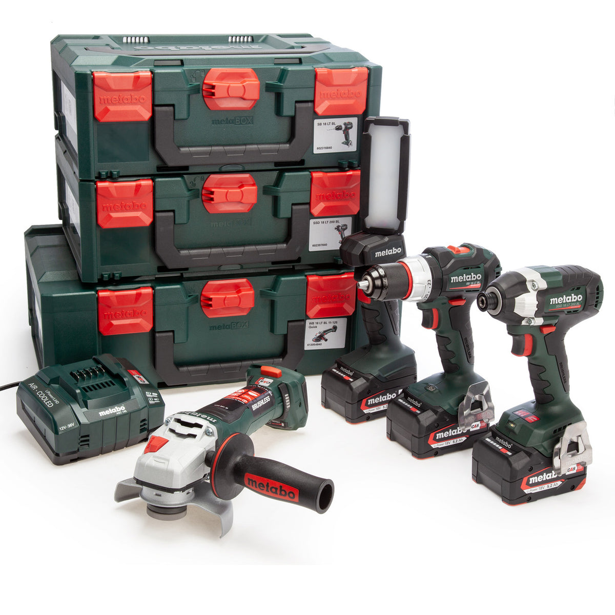 The Metabo UK685200004 is a Cordless 18V Set of 4 Tools consisting of the WB 18 LT BL 11-125 Quick (613054840) Cordless Angle Grinder, SB 18 LT BL (602316840) Cordless Hammer Drill, SSD 18 LT 200 BL (602397840) Cordless Impact Driver, SLA 14.4-18 LED (600370000) Cordless inspection Lamp, 3 x 5.2Ah Batteries, ASC 145 Charger, 1 x metaBOX 165 L and 2 x metaBOX 145s.