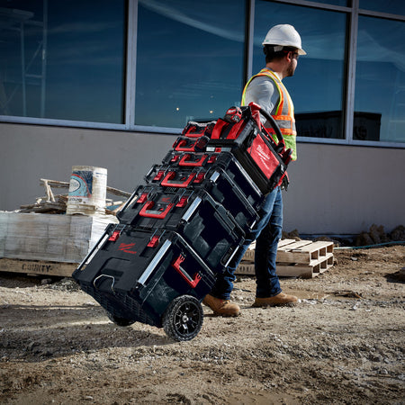 The Milwaukee 4932464078 trolley box is part of the Packout modular storage system, which allows you to stack multiple boxes on top of eachother to customise your tool storage solution to suit your needs. This tool box has a large 113kg weight capacity and is constructed with impact resistant polymers for jobsite durability. It has an IP65 rated weather seal to keep out rain and jobsite debris and features an interior organiser tray for smaller accessories.
