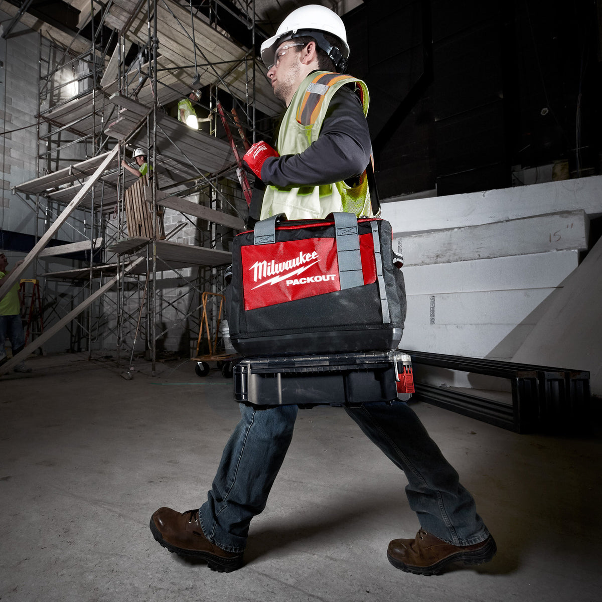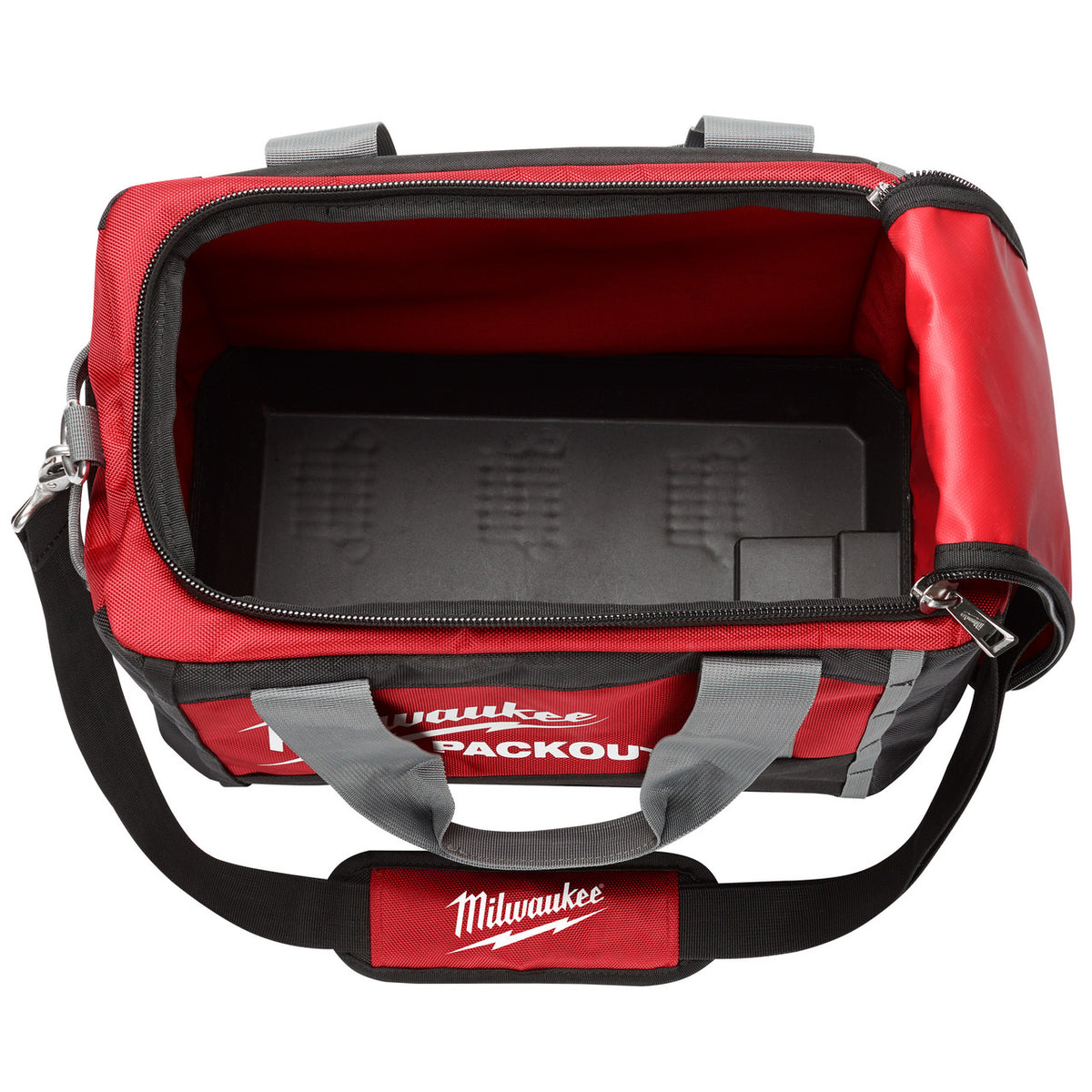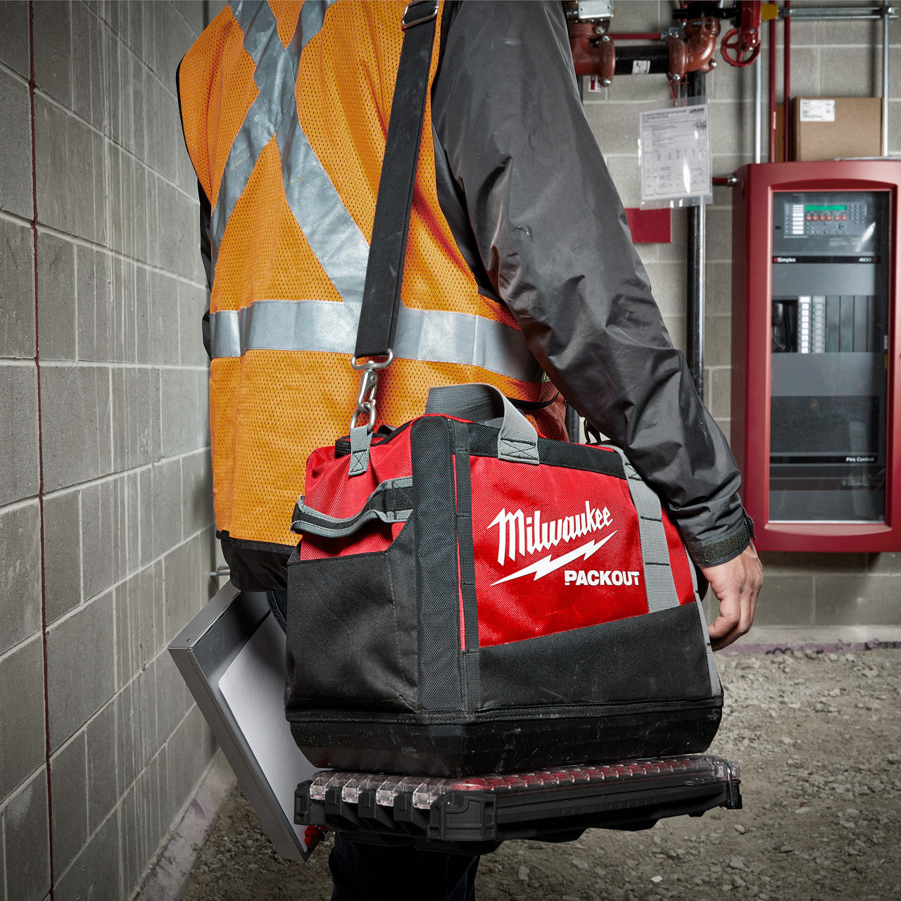 The Milwaukee 4932471066 Packout Duffel Bag has a cushioned shoulder strap, top and side handles for flexible carrying