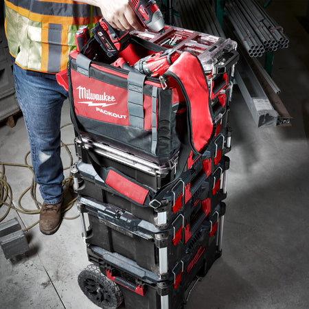 The Milwaukee 4932471066 Duffel Bag is part of the PACKOUT modular storage system. It measures 427 x 381 x 254mm and is made from 1680D Ballistic Material for jobsite durability.