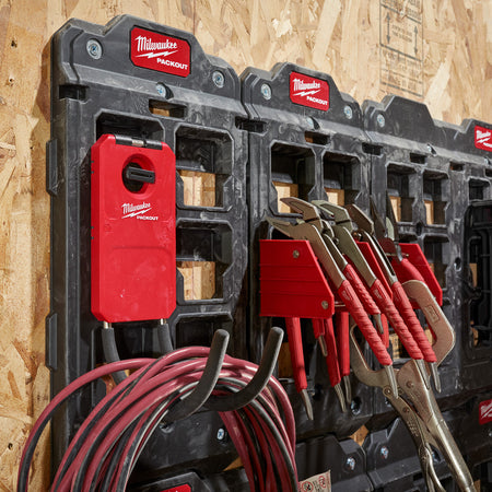 The Milwaukee 4932480701 is a Curved Utility Hook that is part of the Packout range for tool storage. The high-strength steel hooks are designed for storing even heavy tools and items up to 11kg. Stores cords, hammers, step stools. Requires a mounting plate, not included.