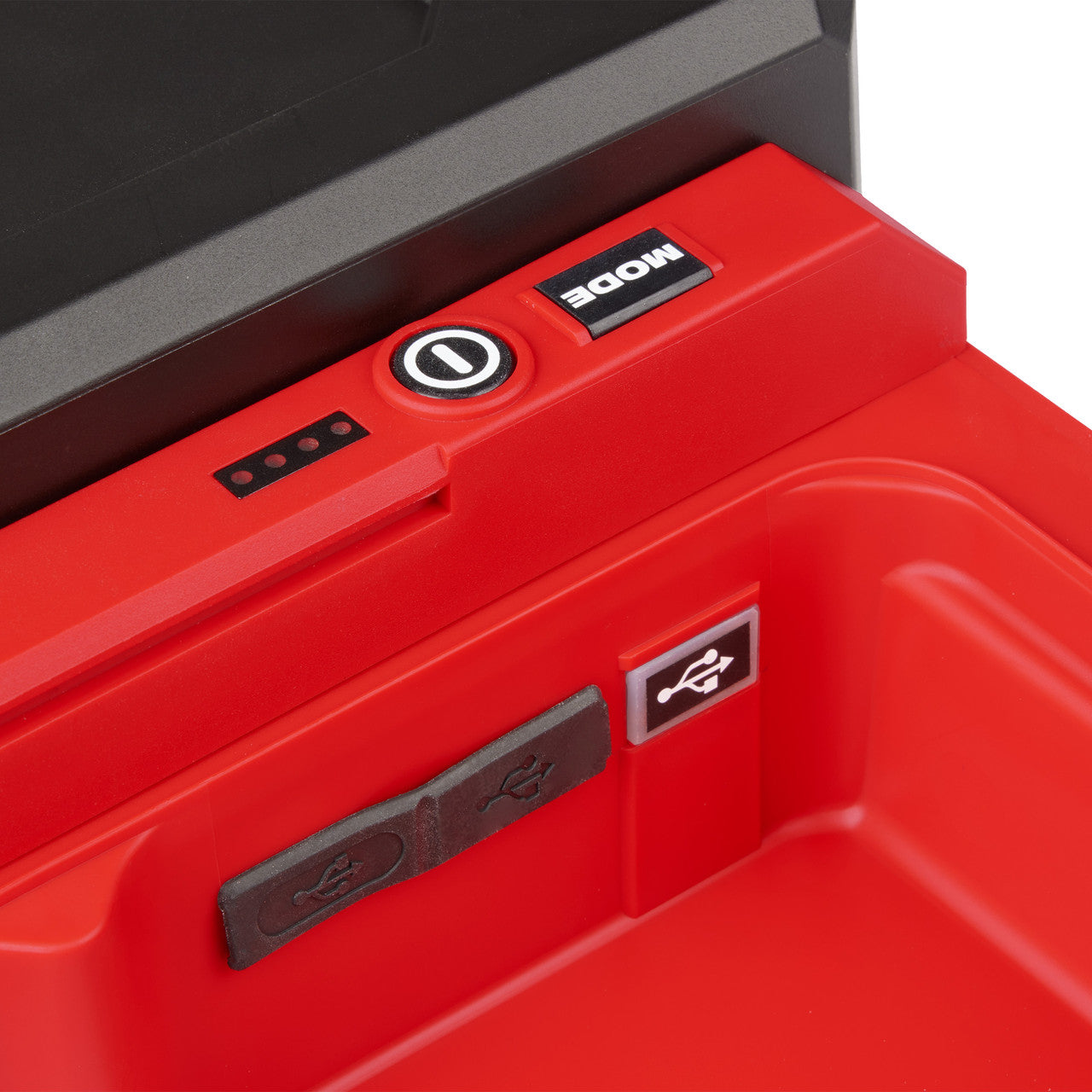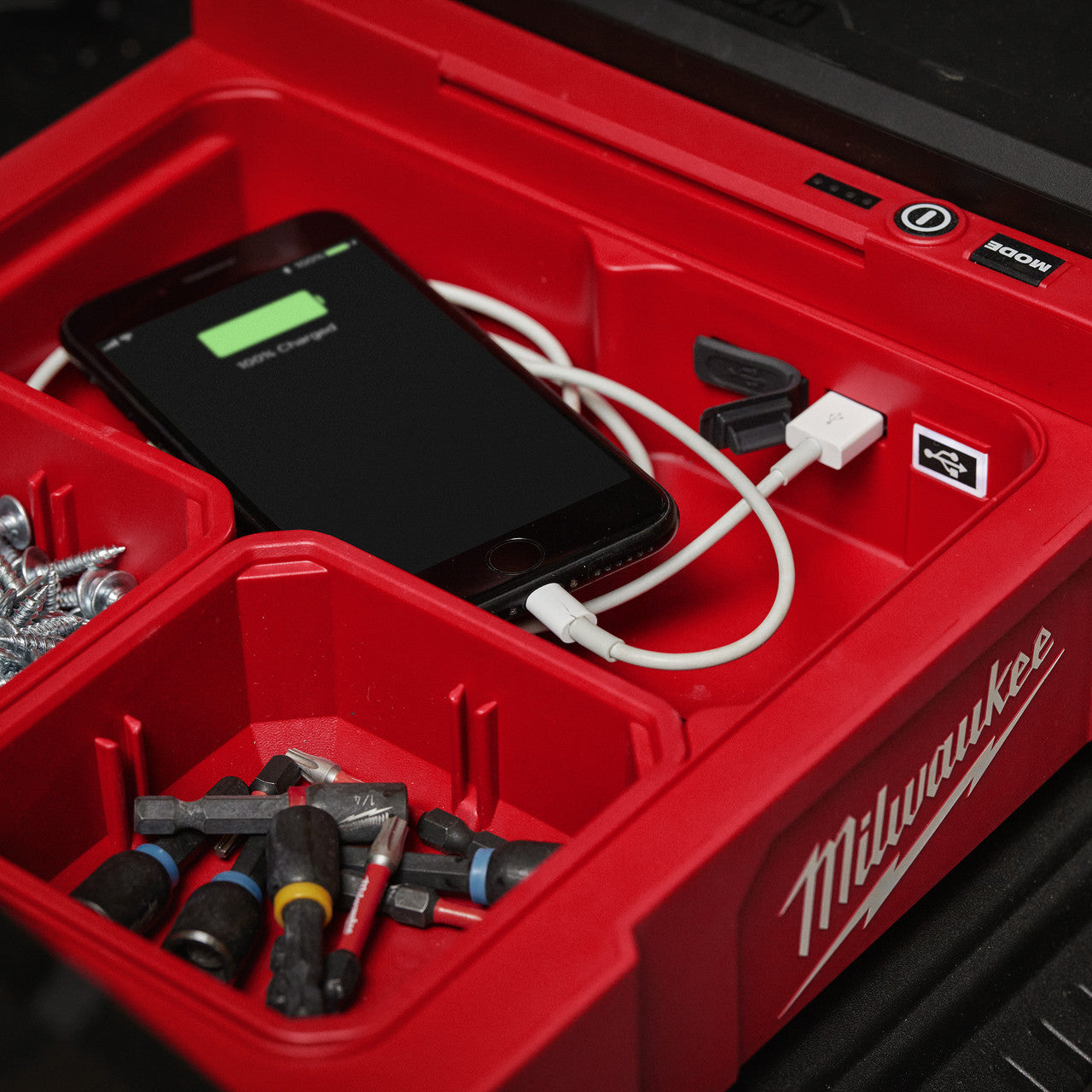 The Milwaukee M12 POAL-0 Packout LED Area Light has a storage compartment for devices and small items