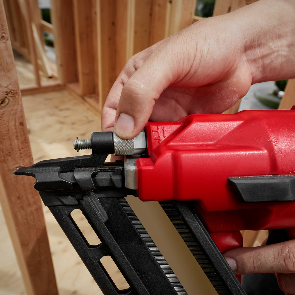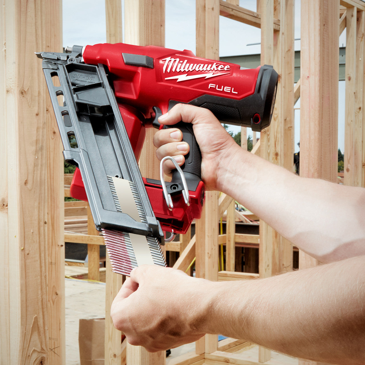 The Milwaukee M18 FFN-0C FUEL Framing Nailer fires standard framing nails which fit an angled magazine at 30° or 34°