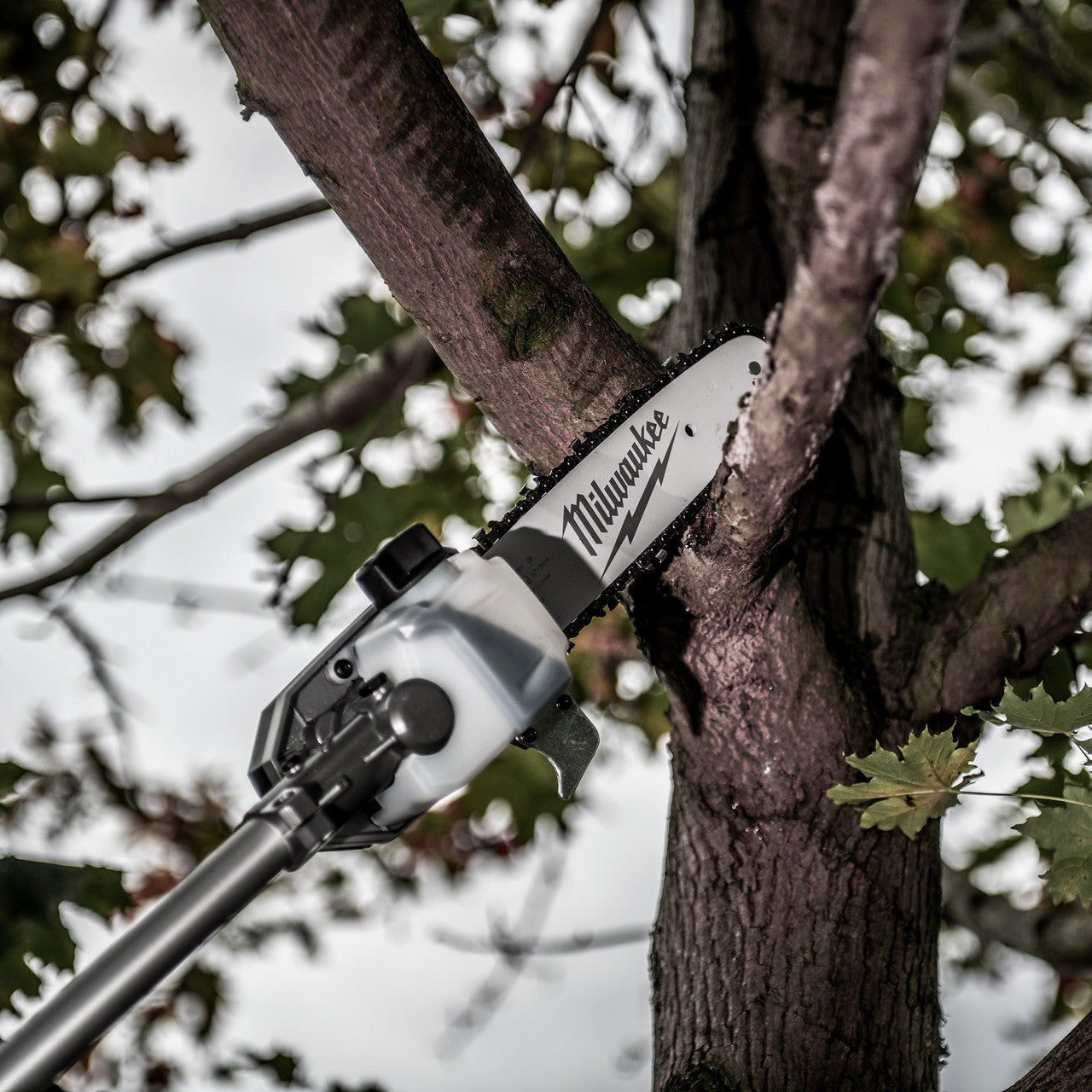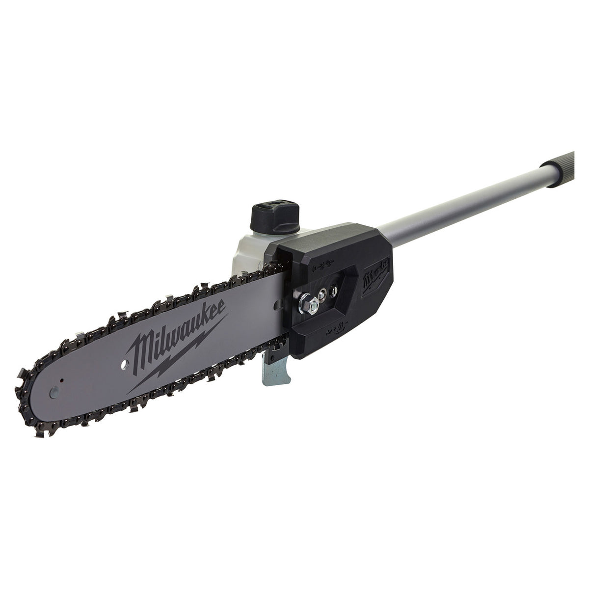 The Milwaukee M18 FOPH-CSA QUIK-LOK Chainsaw Attachment is compatible with Milwaukee M18 FUEL Outdoor Power Head QUIK-LOK Attachment System. This is the ideal attachment for cutting down overhead tree branches. The cutting bar measures 25.4cm in length with an overall length of 124.5cm giving a good cutting height. If you need to go higher an additional compatible 91cm extension pole is available (Not included).