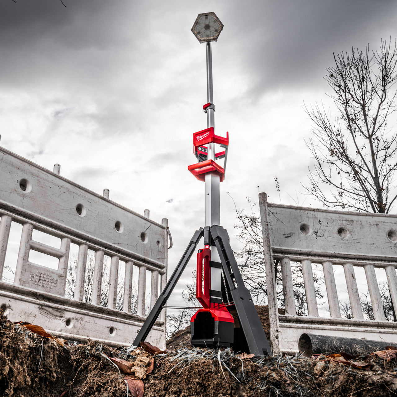 The Milwaukee SAL2-0 M18 LED Stand Light has an impact-resistant adjustable head with a highly durable polycarbonate lens that can be rotated 230°