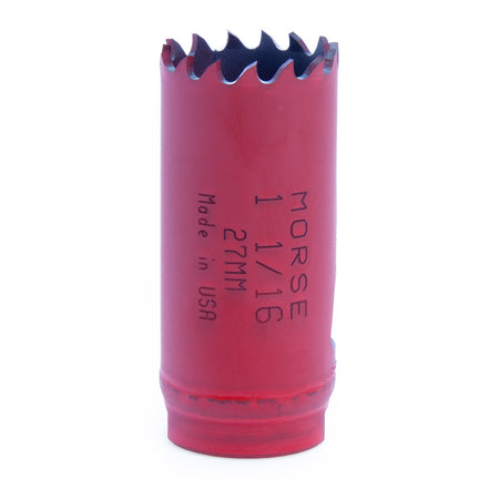 The Morse MHS17 (177177) Bi-Metal Hole Saw has a diameter 1. 1/16in - 27mm. The All-New Advanced Bi-Metal Hole Saw by Morse is their latest sawing innovation, a simple optimized powerhouse. Engineered for optimum cutting performance and longer life. The exceptional durability yields cost per cut savings over other saws. Applications in: Wood, plastic, machinable metals, stainless steel alloys, nail-embedded wood. Sold without Arbor or Pilot Drill. Compatible with Morse MA34 (139014) 3/8in Hex Pin Arbor.