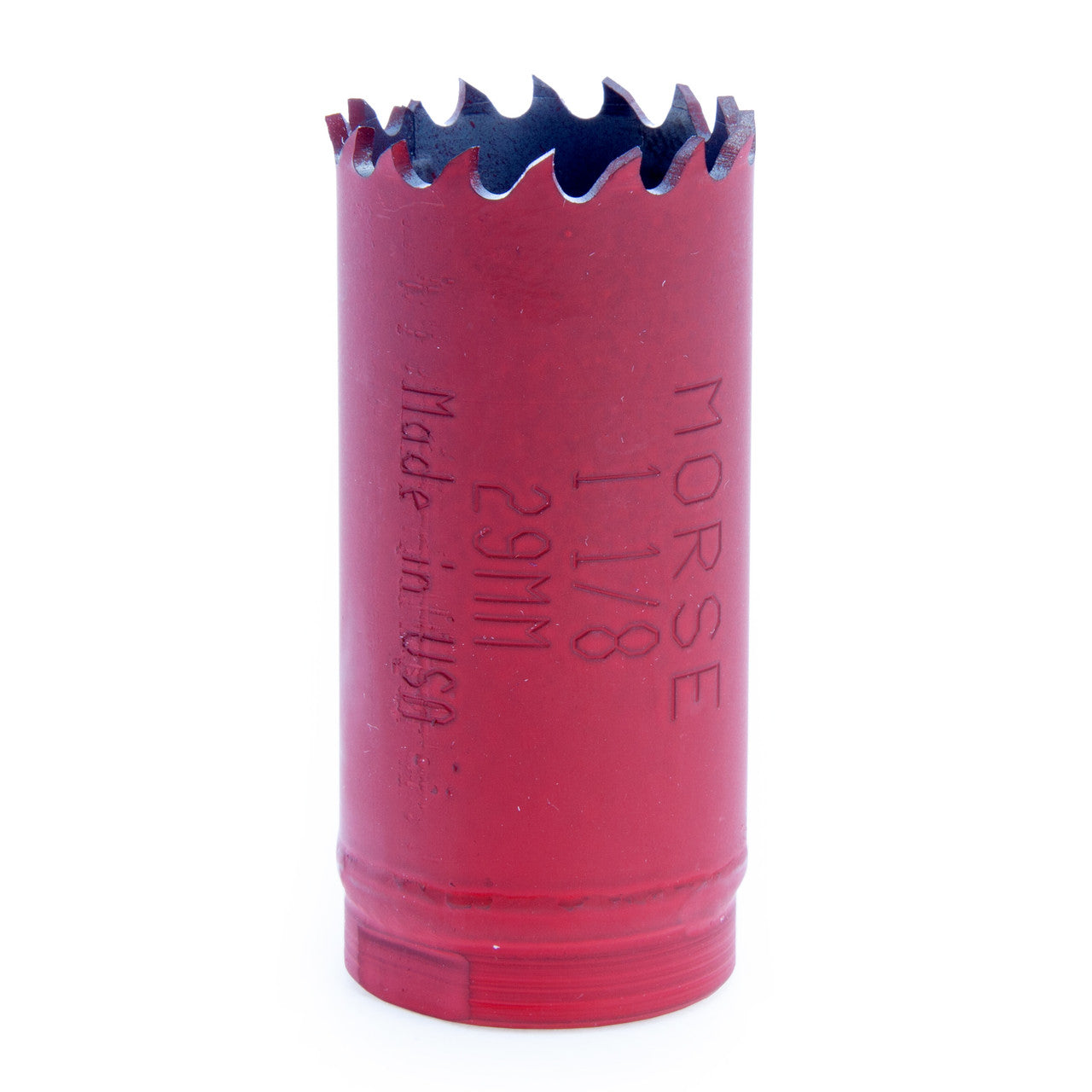 The Morse MHS18 (177184) Bi-Metal Hole Saw has a diameter 1. 1/8in - 29mm. The All-New Advanced Bi-Metal Hole Saw by Morse is their latest sawing innovation, a simple optimized powerhouse. Engineered for optimum cutting performance and longer life. The exceptional durability yields cost per cut savings over other saws. Applications in: Wood, plastic, machinable metals, stainless steel alloys, nail-embedded wood. Sold without Arbor or Pilot Drill. Compatible with Morse MA34 (139014) 3/8in Hex Pin Arbor.