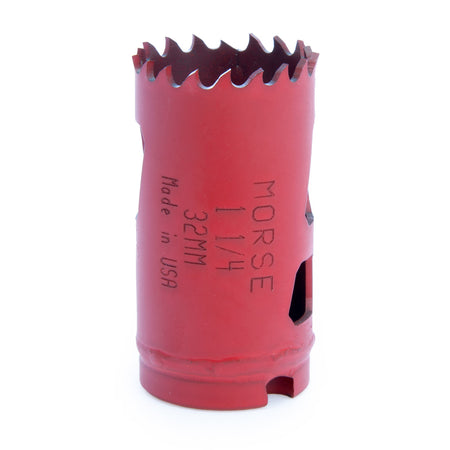 The Morse MHS20 (177207) Bi-Metal Hole Saw has a diameter of 1. 1/4in - 32mm. The All-New Advanced Bi-Metal Hole Saw by Morse is their latest sawing innovation, a simple optimized powerhouse. Engineered for optimum cutting performance and longer life. The exceptional durability yields cost per cut savings over other saws. Applications in: Wood, plastic, machinable metals, stainless steel alloys, nail-embedded wood. Sold without Arbor or Pilot Drill. Compatible with Morse MA45PS (139038) 7/16in Hex Pin Arbor.