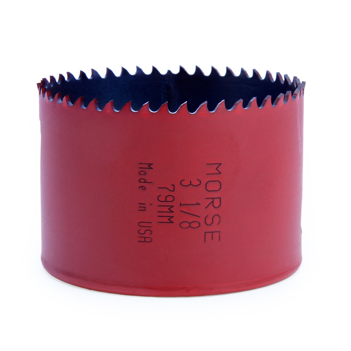 The Morse MHS50 (177504) Bi-Metal Hole Saw has a diameter 3. 1/8in - 79mm. The All-New Advanced Bi-Metal Hole Saw by Morse is their latest sawing innovation, a simple optimized powerhouse. Engineered for optimum cutting performance and longer life. The exceptional durability yields cost per cut savings over other saws. Applications in: Wood, plastic, machinable metals, stainless steel alloys, nail-embedded wood. Sold without Arbor or Pilot Drill. Compatible with Morse MA45PS (139038) 7/16in Hex Pin Arbor.