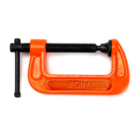 The 2 Inch Pony 2620 C-clamp is part of America's most popular and complete line. The smoothly cut, acme-threaded steel screw is zinc plated and protected with a black finish for lasting durability. The clamp casting is made with ductile iron for strength before receiving a powder-coated Pony-orange finish. Available in a wide variety of sizes and clamping forces, all with full-closing screws.