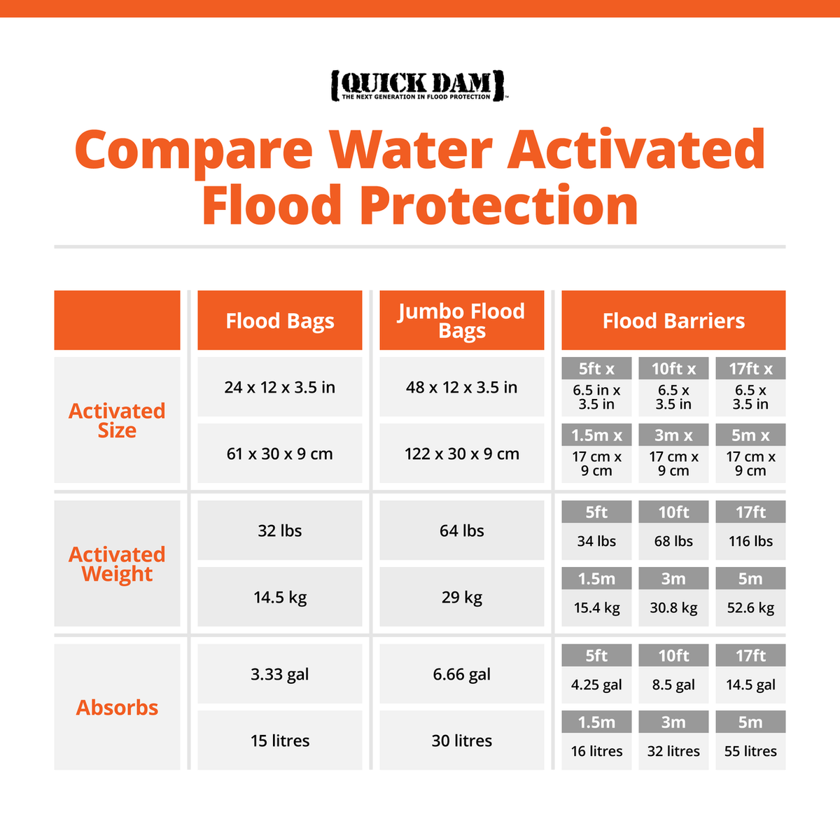 The Quick Dam QD65-1 absorbs, swells and gels oncoming water on contact to create a durable barrier