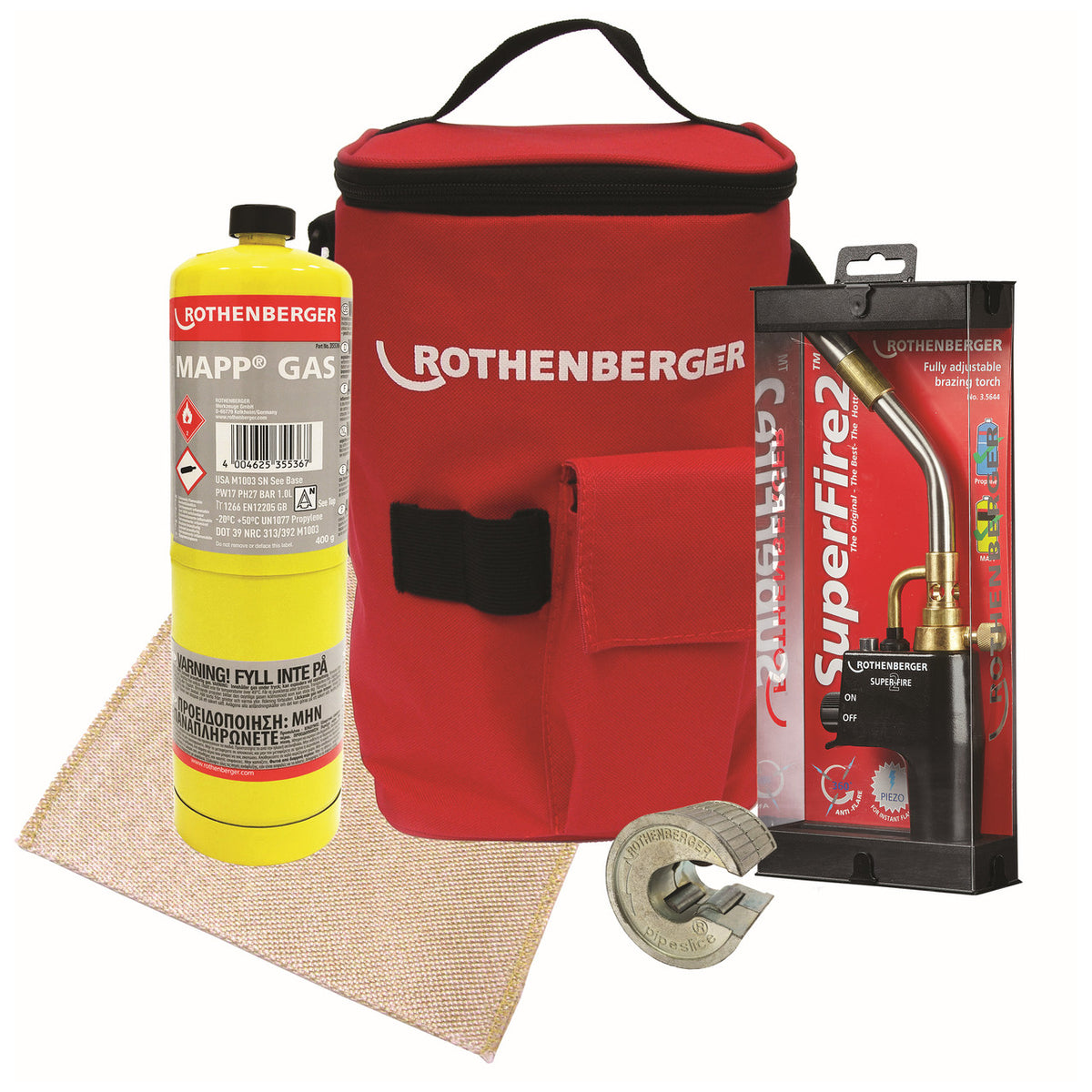 This Rothenberger Hotbag Set contains a Superfire 2 torch, a disposable canister of MAPP gas, a heatproof soldering mat, and a 15mm pipe slice tube cutter inside a hot bag. This is a great starter kit, containing tools and equipment to get the job started, ideal for plumbers.