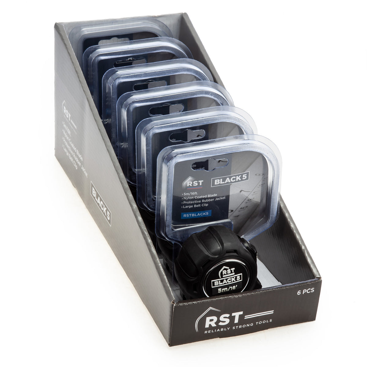 The RST BLACK5 is a 5m/16ft Pocket Tape with a heavy-duty rubberized case and a sturdy lock and a belt clip. The 25mm wide blade has an adjustable end tab and is Class II certified. The blade has a wipe-clean nylon coating.