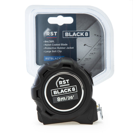 The RST BLACK8 is an 8m/26ft Pocket Tape with a heavy-duty rubberized case and a sturdy lock and a belt clip. The 25mm wide blade has an adjustable end tab and is Class II certified. The blade has a wipe clean nylon coating.