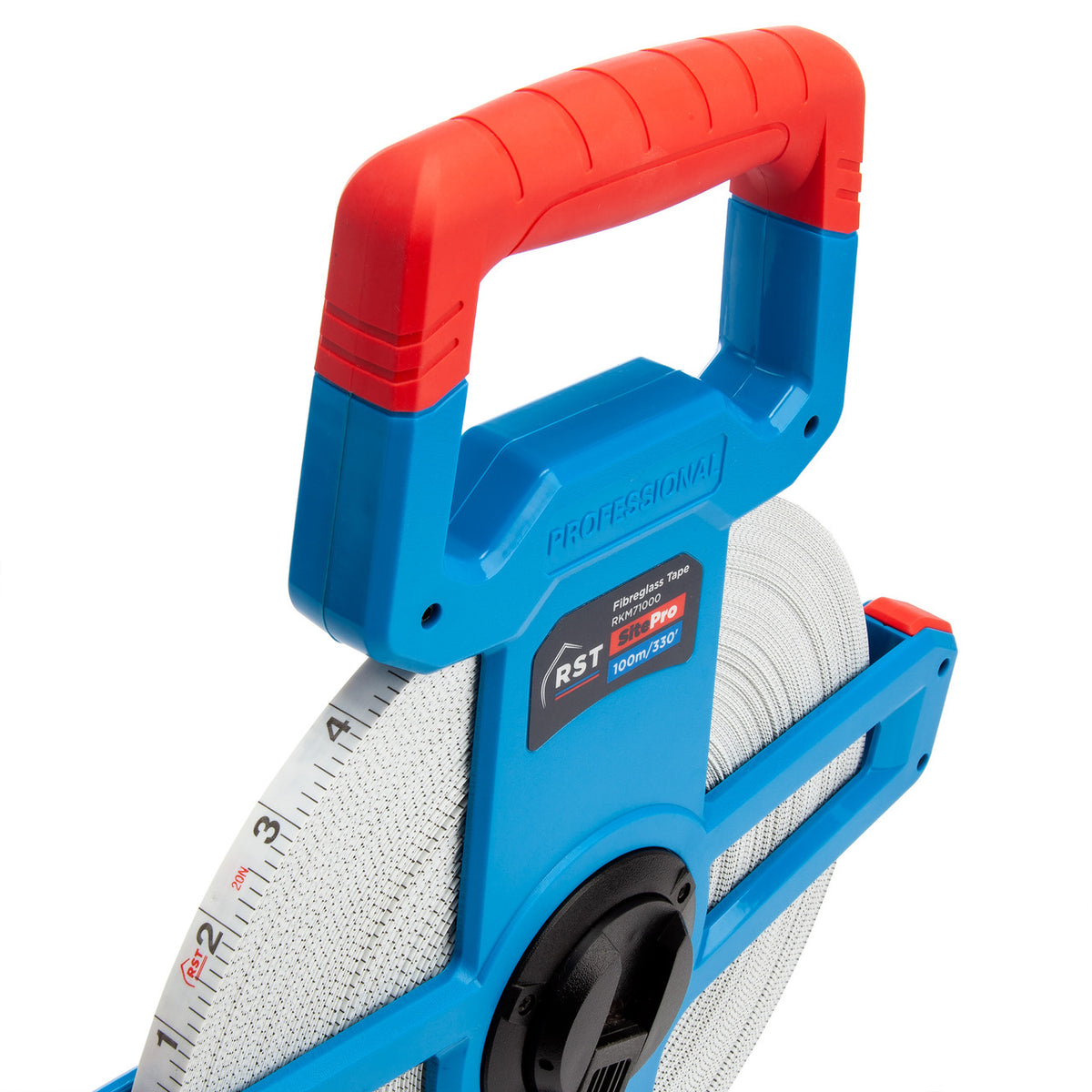 The RST RKM71000 is an open framed 100 metre long geared tape. Designed with a heavy-duty fiberglass blade which is corrosion resistant and hardwearing. This tape has an easy-grip winding handle with a 3:1 rewind ratio return. With both metric and imperial markings this tape has a colourful design making it easy to recognise. The claw at the end of the blade is ideal for wedging into material to keep the end secure enabling you to read an accurate measurement.