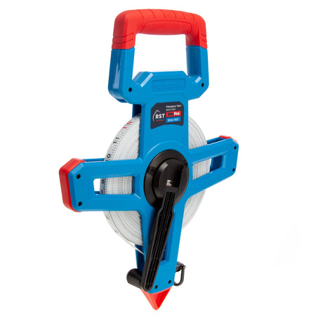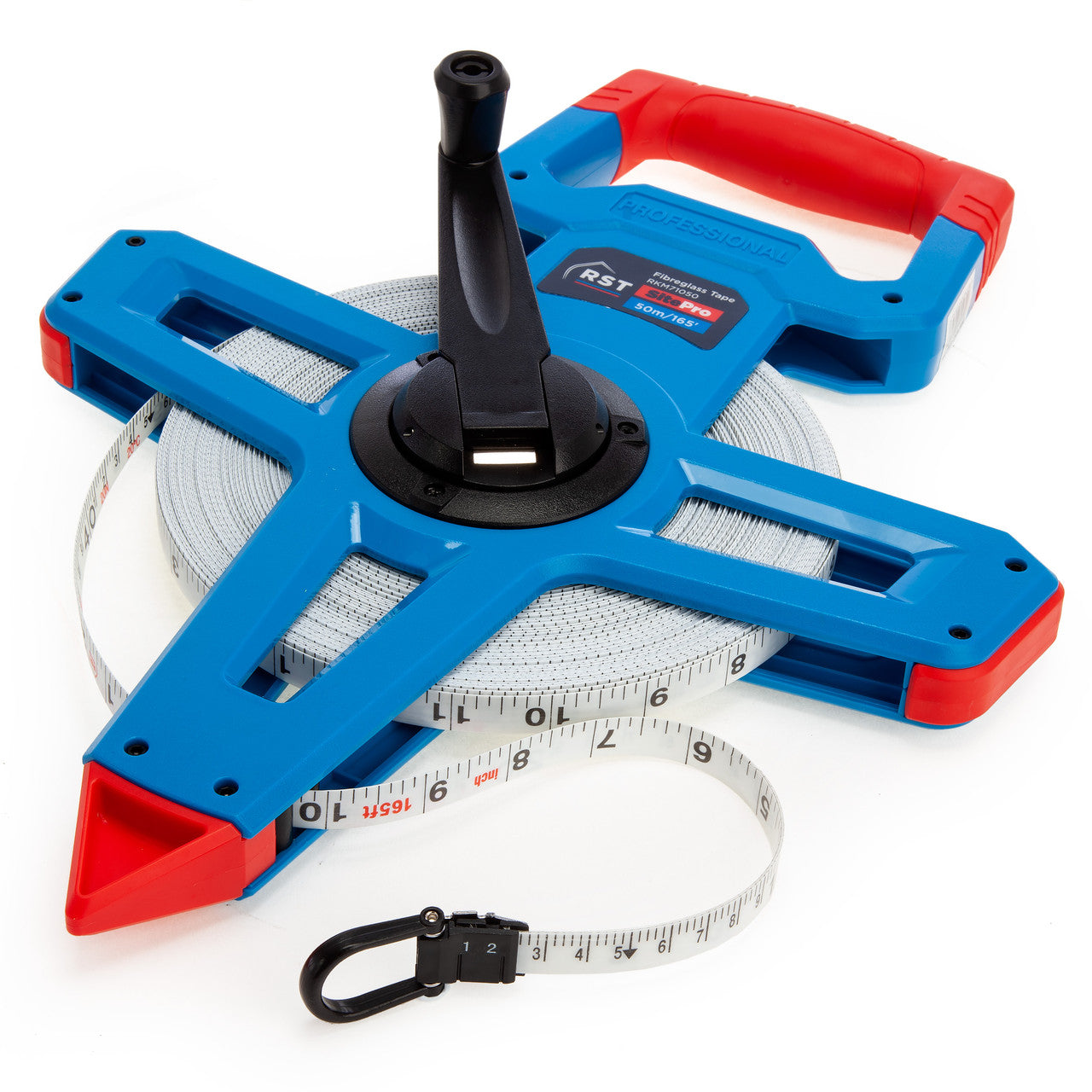 The RST RKM71050 is an open framed 50 metre long geared tape. Designed with a heavy-duty fiberglass blade which is corrosion resistant and hardwearing. This tape has an easy-grip winding handle with a 3:1 rewind ratio return. With both metric and imperial markings this tape has a colourful design making it easy to recognise. The claw at the end of the blade is ideal for wedging into material to keep the end secure enabling you to read an accurate measurement.