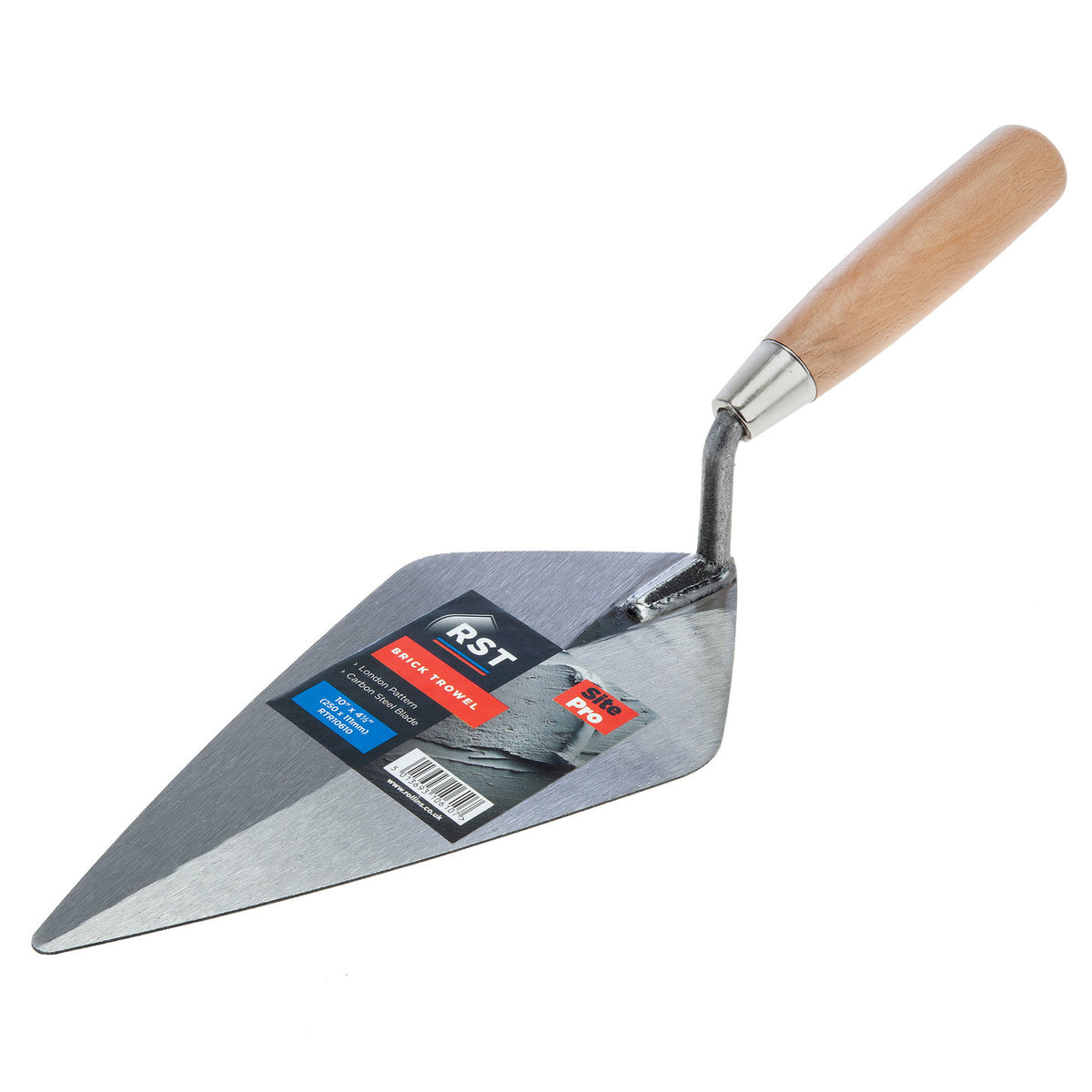 The RST RTR10610 London Pattern Brick Trowel has a 10" / 250mm carbon steel blade that is tapered and ground. A hardwood handle with a metal ferrule gives a traditional feel. The London brick trowel pattern has a rounded heel and carries mortar farther forward on the blade, making it ideal for brickwork.