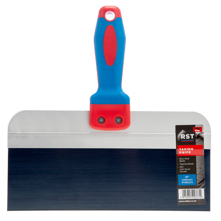 The RST RTR81272 10 Inch Taping Knife is designed for spreading compound and plaster. A wide blade enables smooth finishing over joints and drywall tape. The 250mm blue steel blade is slightly tapered. The soft-touch handle provides comfort.