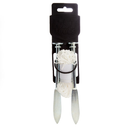 The RST RTR91P Builders Line and Pins Set consists of 2 metal pins and 50ft/15m of nylon line length. Line pins are typically found in pairs and used as anchor points for a brick line.