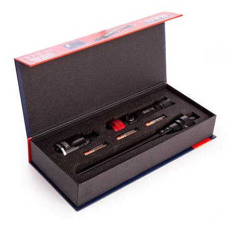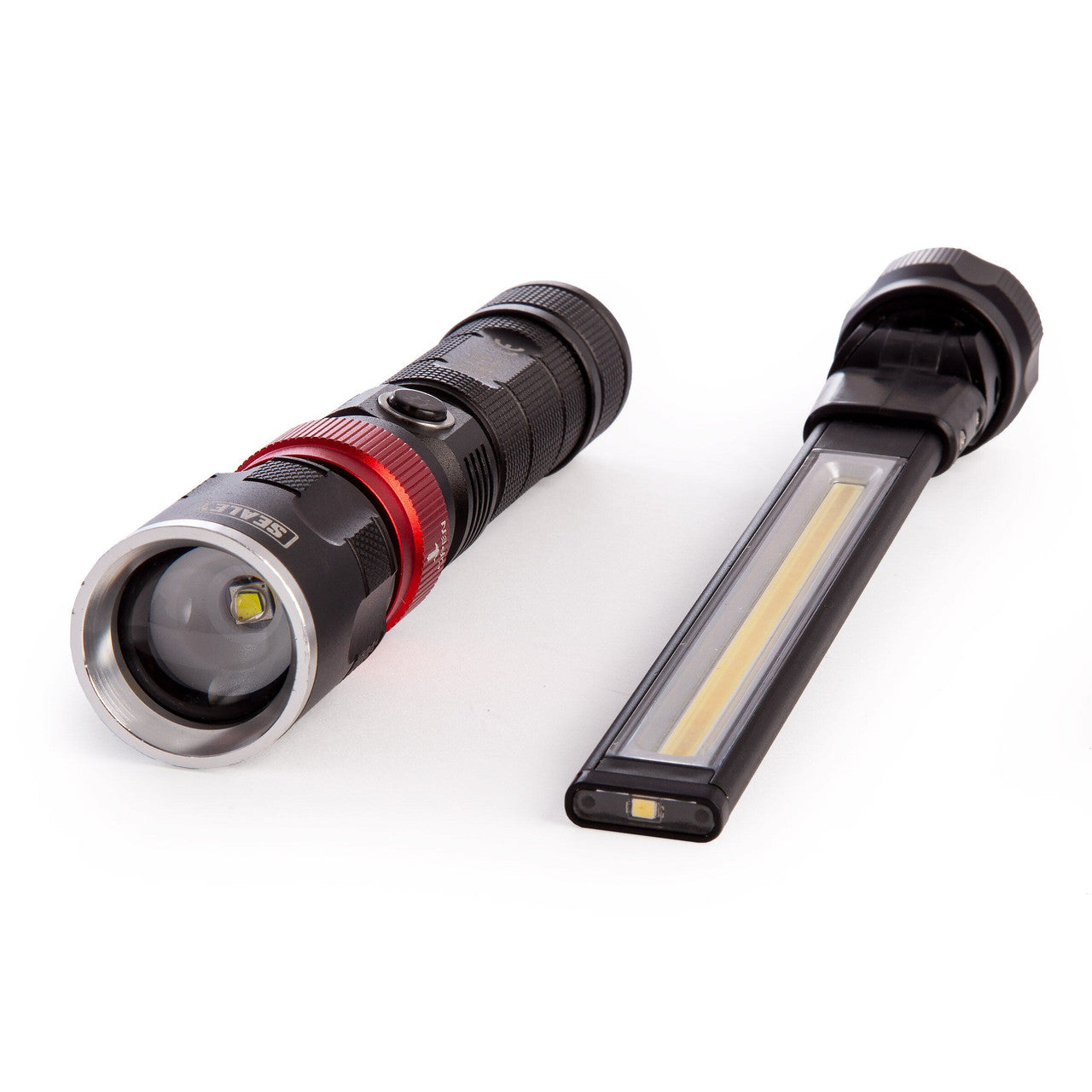 The Sealey LED0121B is a Torch that runs on supplied AAA Batteries and has 2 interchangeable heads for different applications, a torch with sliding focus, and a slimline 350 lumen COB inspection lamp.