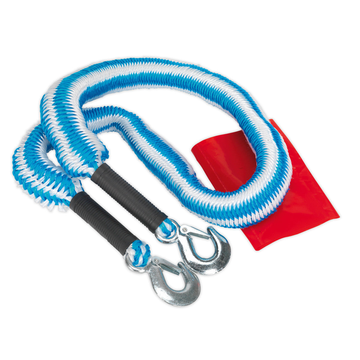The Sealey TH2502 is an elasticated Tow Rope with a metal hook at each end designed to clip on to vehicle towing eye bolts. The rope varies in size from 1.5 - 4 metres which helps to avoid dragging on the ground if there is slack between gear changes or braking. It has a Rolling Load Capacity of 2000kg and comes in a small circular carry case for neat storage in car boot.