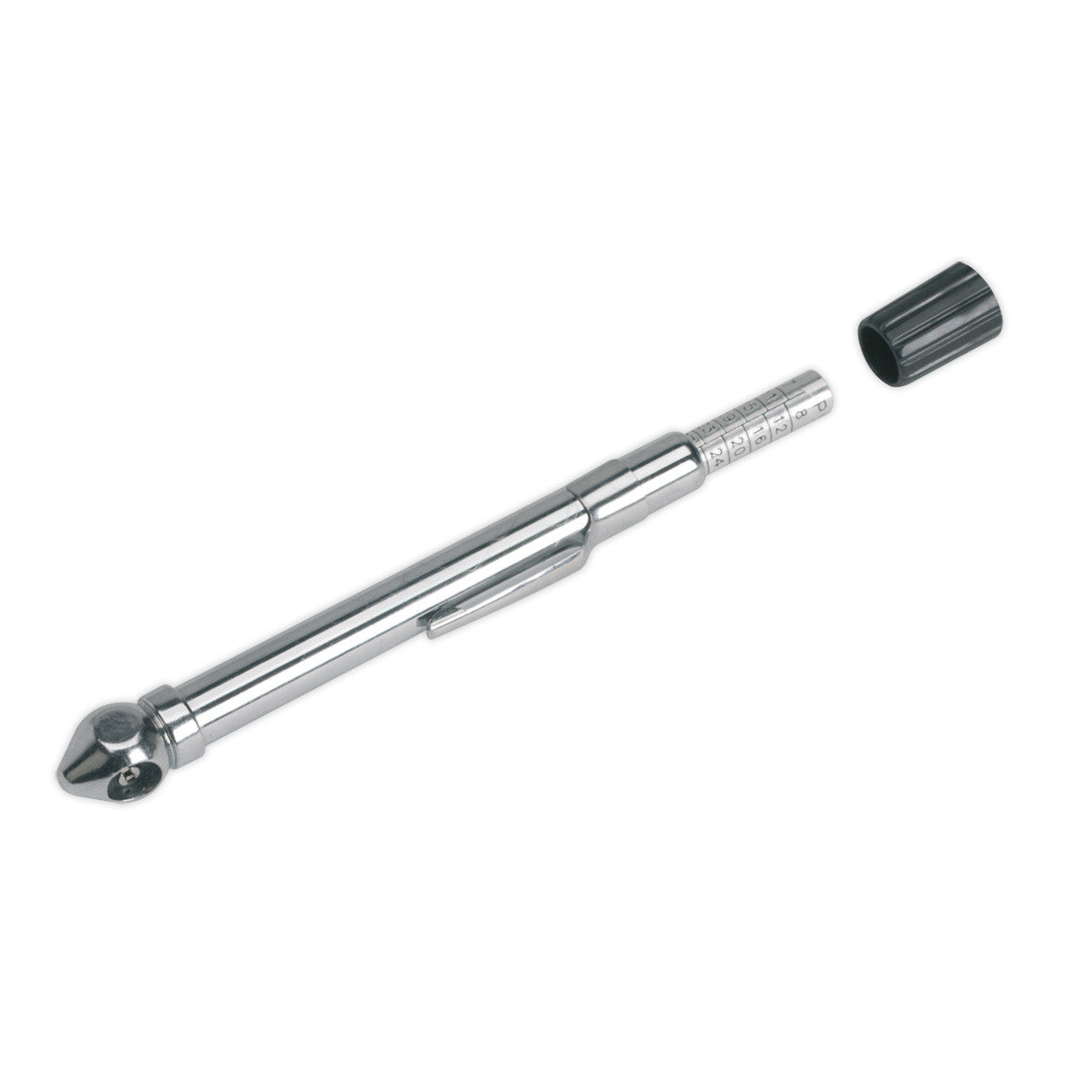 The Sealey TSTPG9 Tyre Pressure Gauge with Pocket-Clip has a pressure scale range from 6-50psi