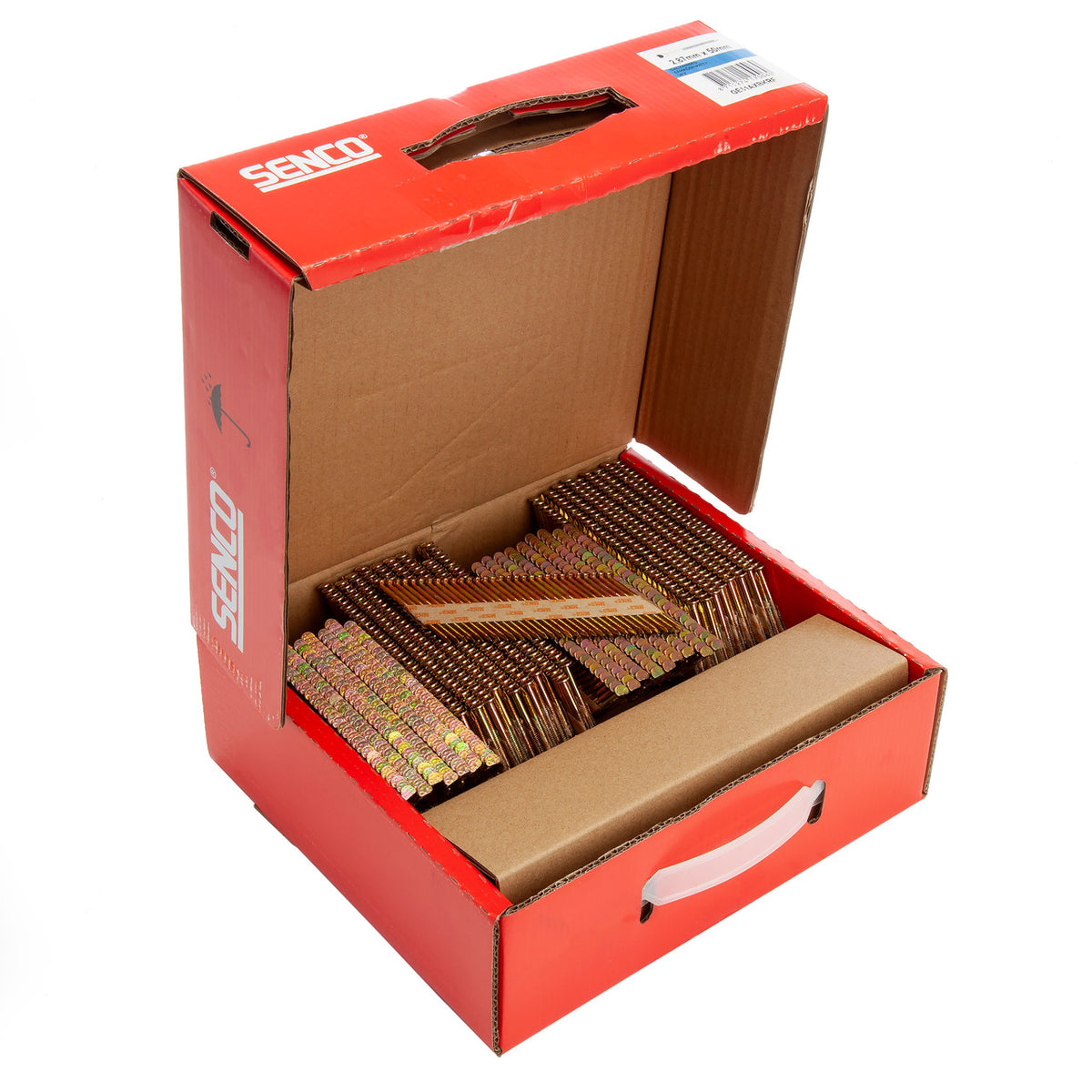 The Senco GE51AXBKRF is a Box of 2000 Galvanised Collated Ring Shank Nails 2.87mm wide and 50mm in length. They are collated at a 34-degree angle with a Clipped head and designed for use on framing, sheathing, subfloor, decks, trusses and pallets.