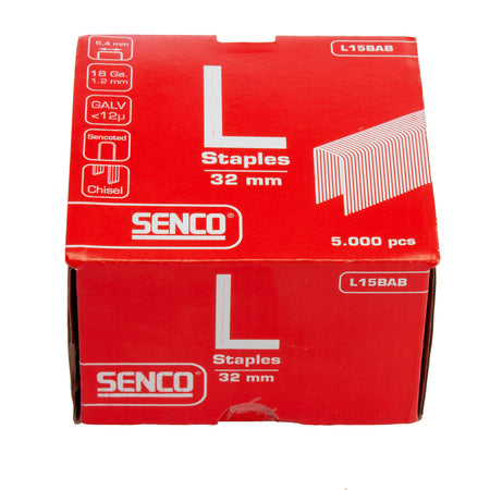 The Senco L15BAB is a Box of 5000 Galvanised L Staples, 6.4mm wide and 32mm in length. They are glue collated at a 0-degree angle with a 1.2mm thick wire size. Specifically for cabinets, casebacks, drawers, upholstery, soffits, underlayment, lattice & insulative sheeting.