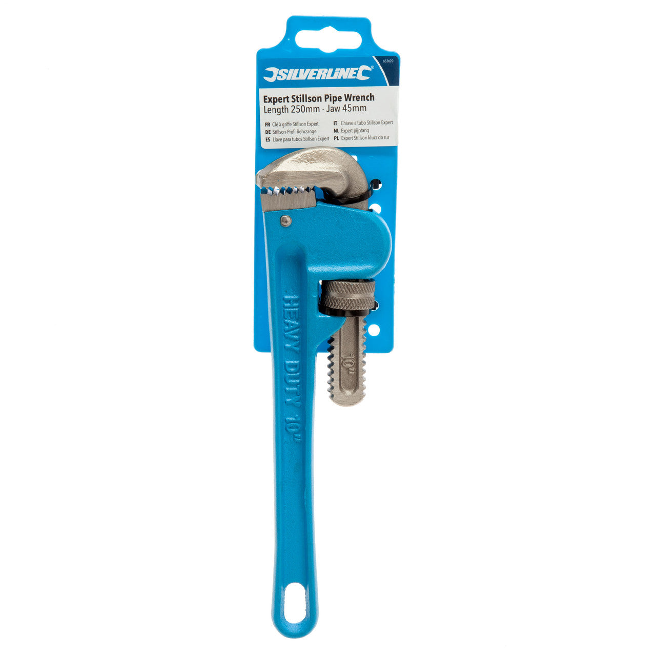 The Silverline 633620 Expert Stillson Pipe Wrench has an overall length of 10 Inch / 250mm and a Jaw Capacity of 1.3/4 Inch / 45mm. The Wrench is made from heavy duty forged steel with hardened serrated jaws.