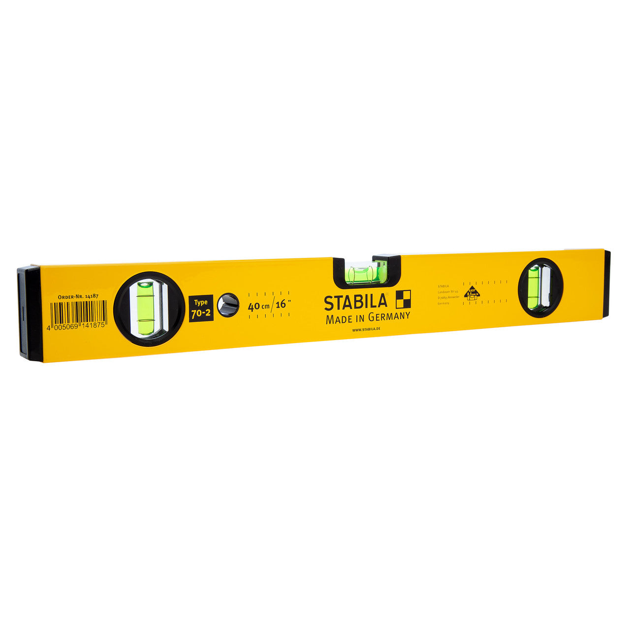 The Stabila 14187 is a 40cm /16 Inch Type 70-2 Spirit Level. Countless professionals have used the Type 70-2 as their level of choice. They are light, reliable and very accurate. With its two vertical vials it helps you to take a reading in any position. As with all Stabila levels the vial is precisely aligned with the measuring surface then locked together ensuring long life accuracy.