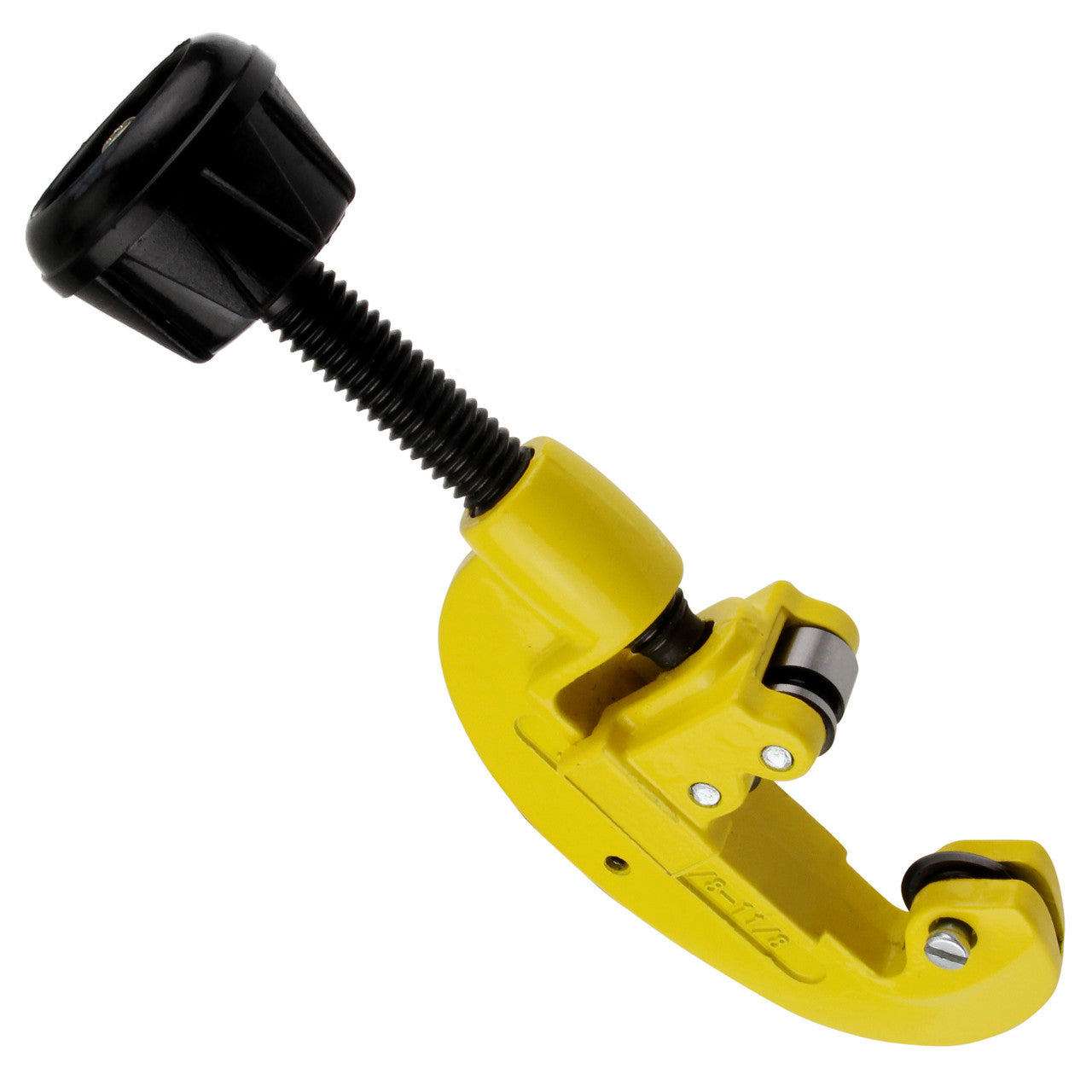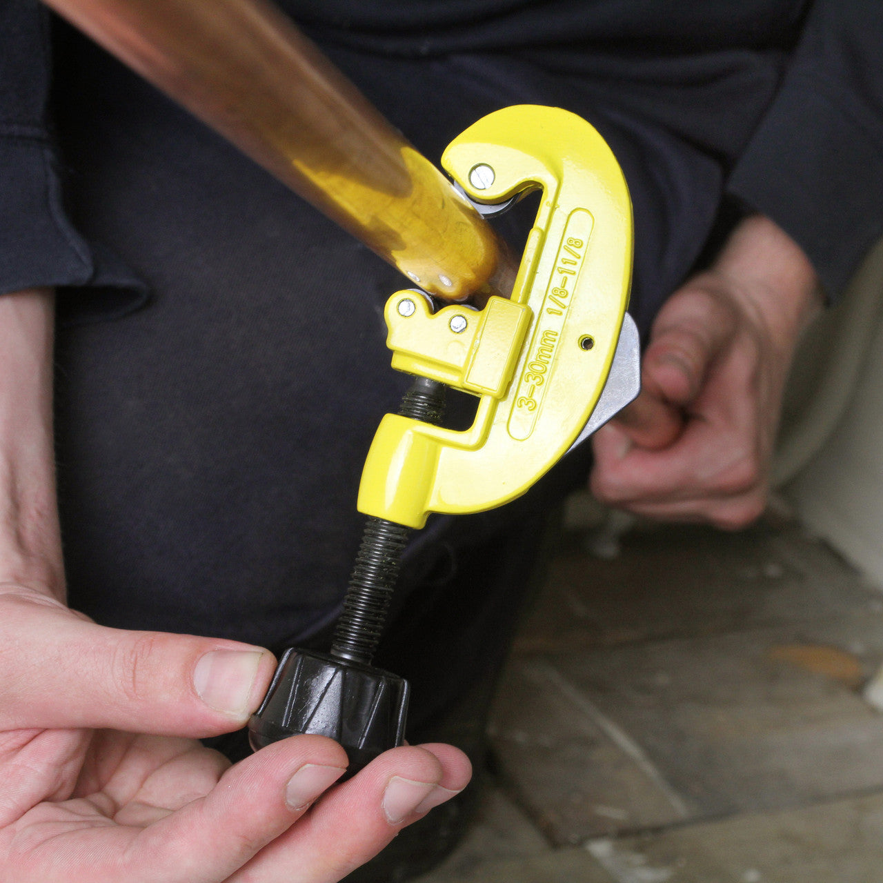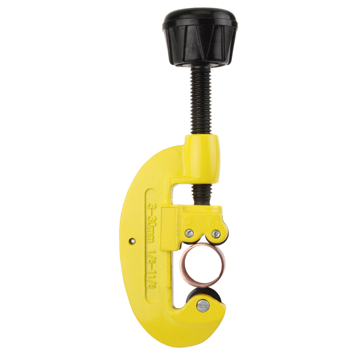 The Stanley 0-77-448 Adjustable Pipe Cutter has an all-metal body and steel guide rollers for a long service life and accuracy. The Cutter will cut metal piping in diameters from 3mm to 30mm. It comes with 2 cutting wheels, one stored in the handle and a pipe-deburring fold-out blade.