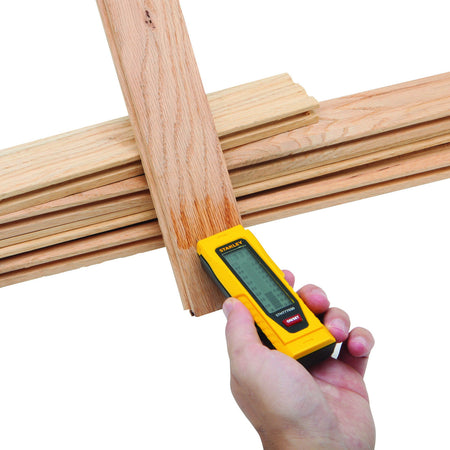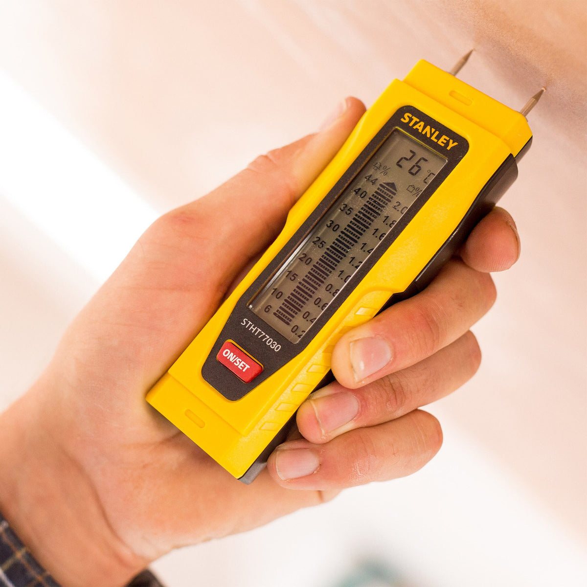 The Stanley 0-77-030 Moisture Meter features an LCD display with bar graph