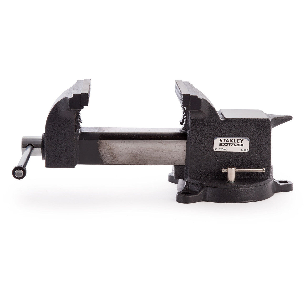 The Stanley 1-83-068 is 14kg cast iron vice with a 6 inch clamping capacity and a clamping force of 2200kg. It has a lockable swivel base which allows you to position the work piece and use the safest working position rather than compromise, as you would with a fixed vice. There are three holes in the base of the Vice to attach securely to a workbench.