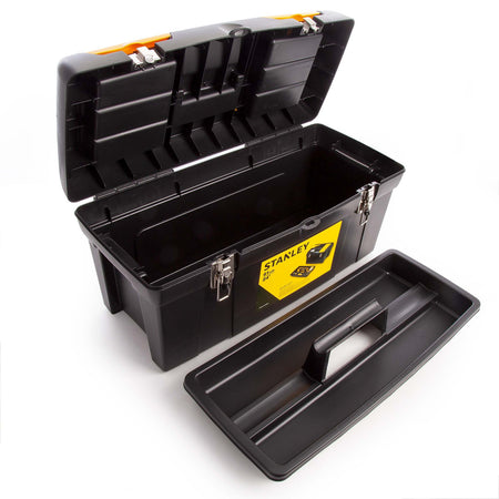 The Stanley 1-92-067 is a 24-inch toolbox with 2 metal latches and 2 exterior top lid compartments for storing fixings, screws, plumbing and electrical components etc. Internally there is a removable tote tray ideal for storing the most used tools such as knives, screwdrivers and tapes for quick and easy accessibility. It is extremely robust and durable