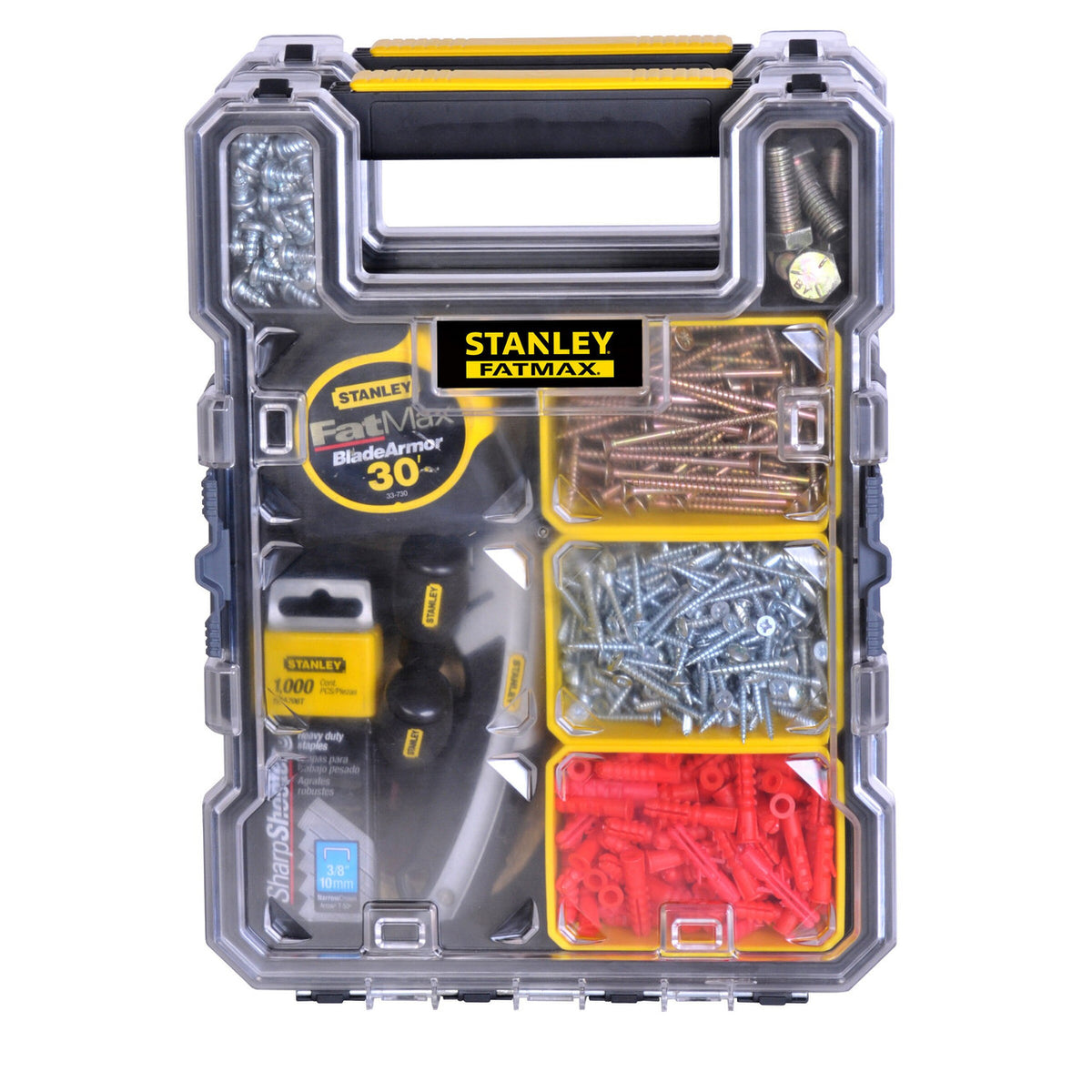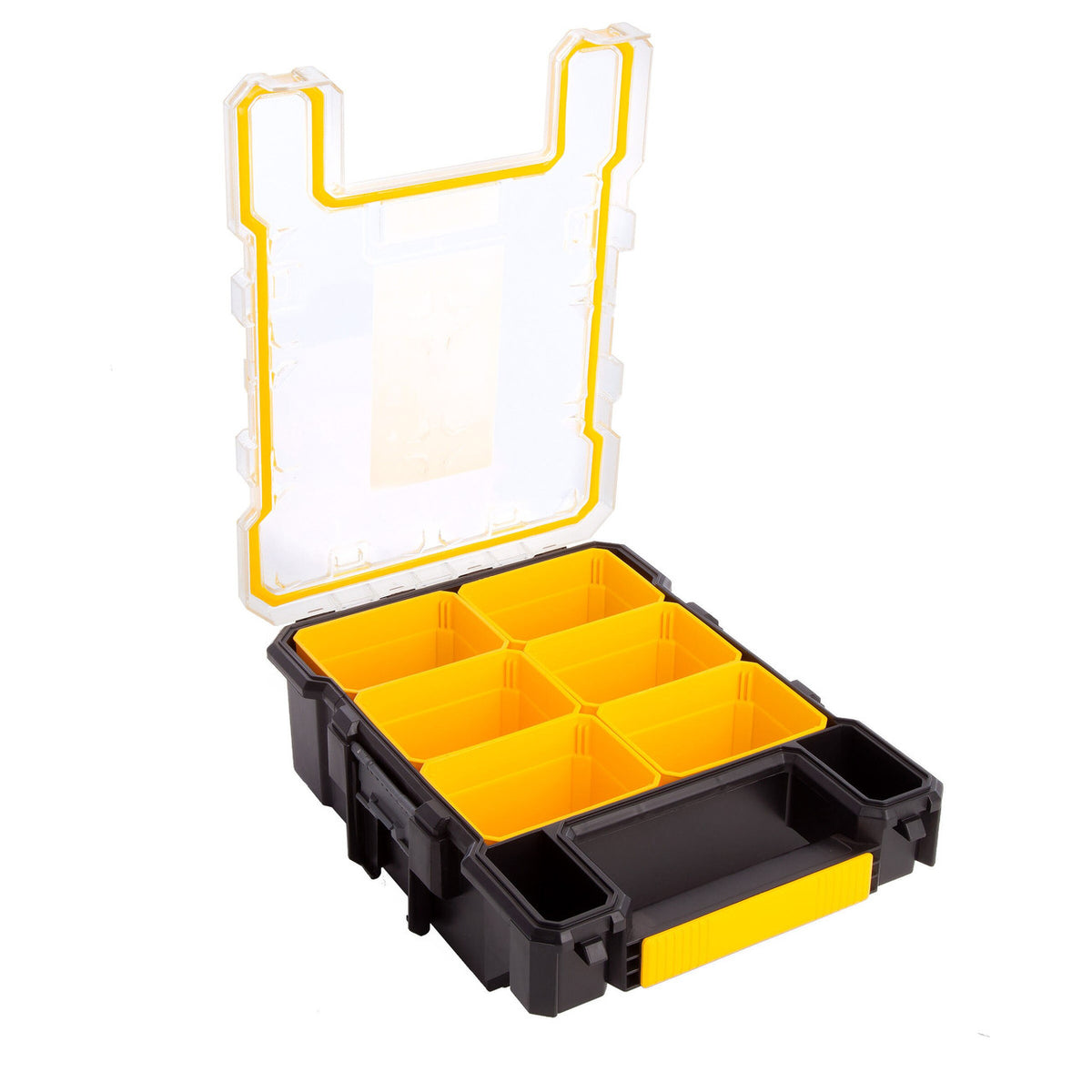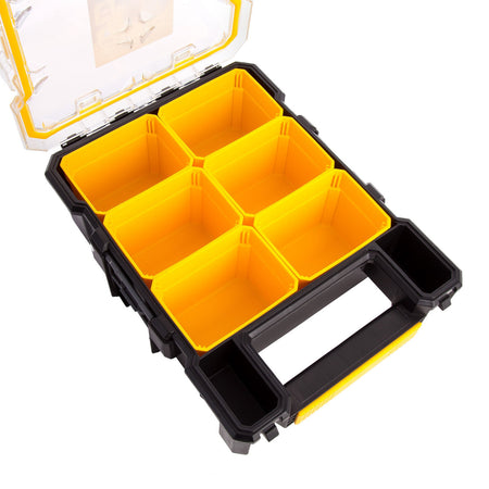This virtually unbreakable Stanley FatMax organiser has 6 deep storage compartments which are removable and can be stacked together for use outside the organiser. With external measurements of 350 x 260 x 110mm, it is perfect for providing storage for small parts, components or accessories in the workshop or for transportation. The polypropylene lid is transparent allowing the contents to be viewed easily and has a waterproof seal to keep inner contents free from water damage.