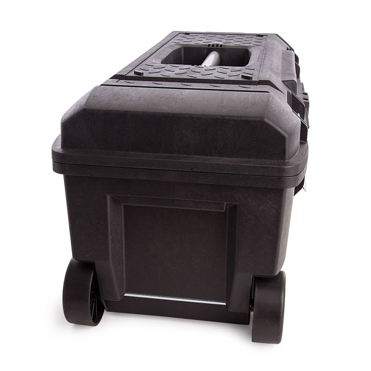The Stanley Tools FatMax Structural Foam Toolbox is fitted with wheels and a soft grip telescopic handle, making it ideal for transporting heavier loads on the job. It is constructed of 4mm structural foam plastic for strength, durability and long life. With extra-large storage capacity, there is a portable tote tray that fits into the toolbox for organising and carrying smaller tools and accessories. The toolbox offers a waterproof storage solution rated IP53 thanks to the all-around water seal for safe and dry storage. The lid has twin metal latches with padlock eyes for securing the toolbox with your own padlock. There is also a v-groove in the lid that can be used when cutting timber and pipework. This waterproof toolbox features a soft grip carry handle plus wheels and a telescopic handle that can be used when moving heavy loads.