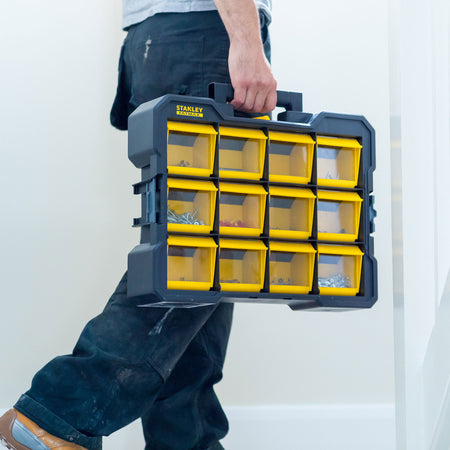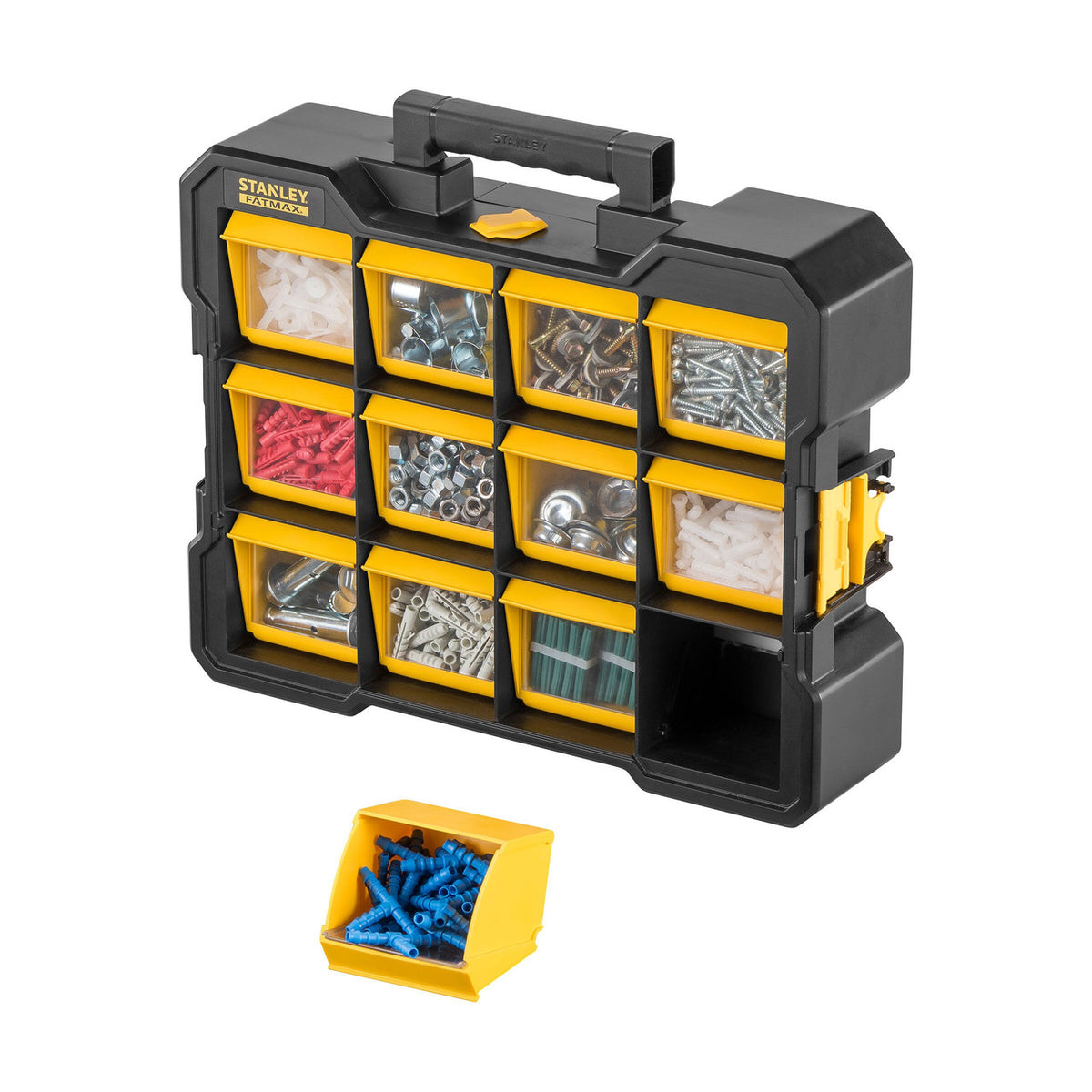 The Stanley FMST81077-1 FatMax Flip Bin Organiser has 12 removable, levered storage compartments, providing storage for small parts, components or accessories. Its lid is made from transparent polypropylene, making it virtually unbreakable whilst allowing a full view of the contents. A plastic handle with textured grip allows the organiser to be moved comfortably. For added versatility, multiple organisers can be clipped together using the side latches for easy transportation.