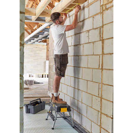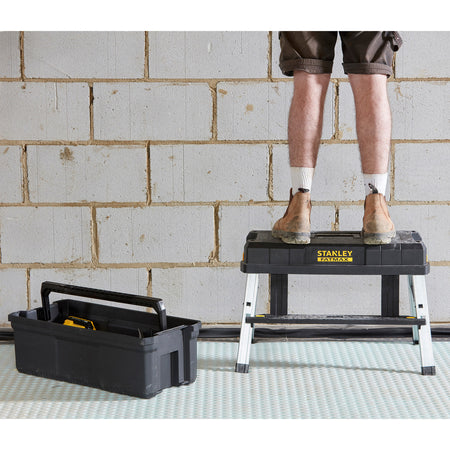 The Stanley FMST81083-1 is a FatMax Work Step and Toolbox combined. It has a lightweight design with a carry handle for ease of transportation. The Toolbox has stainless aluminium legs with non-slip feet which unfold to ensure optimum stability. For added safety the step has been fitted with safety lock buttons. The new 25" Step Stool Toolbox is an innovative and first in the market product. It combines the advantages of tool box, step stool elevated tool box into one product. Designed for all trades and use around the home, it is ideal when reaching those out of reach areas but a ladder is not necessary. The 45cm standing height is ideal for painting and drywall projects.