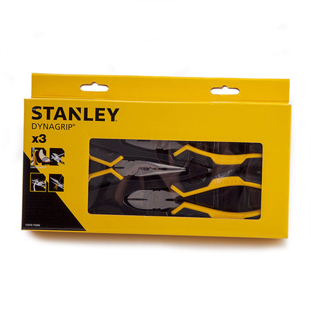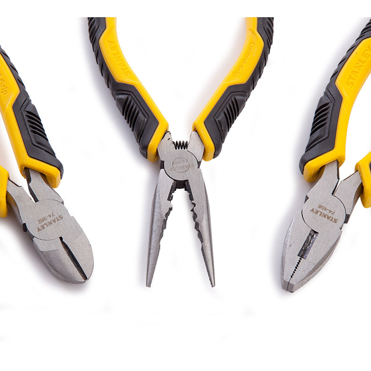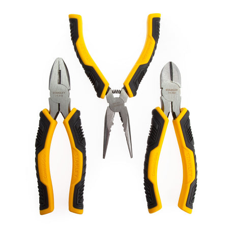 The Stanley STHT0-75094 3 Piece Control Grip Plier Set is made from forged carbon steel with induction hardened blade and tempered jaws for long life. They feature precision milled cutting edges and pivot for a smooth opening and closing of the jaws. ll exposed steel surfaces have been sanded and are protected against corrosion. With a bi-material, ergonomically designed handle that is easy to hold, even with oily hands.