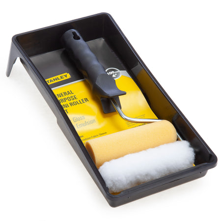 The Stanley STRLGS00 is a 4 Piece Roller Set for Emulsion & Gloss. The 2 rollers measure 4 inches in length and fit onto the frame. Just pour paint into the tray and this set will cover the area needing to be painted quickly and evenly. Tip. When applying gloss to woodwork with a roller, it's a good idea to finish off with a paintbrush for a glossier end result.