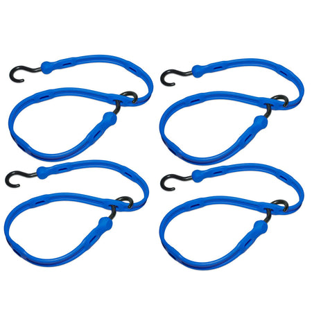 The Perfect Bungee AS36BL4PK-BXST is a pack of 4 FLEXAPURE 91cm/36in bungee straps in Blue. Each Strap features 2 Integrated Nylon Hooks that won't scratch or damage surfaces and 6 reinforced holes for various sizes of load and coverage. These Adjust-A-Strap Bungees are an essential tool for securing a load. The ideal choice for multiple scenarios like garages, vans, pickups, roof racks, truck beds, bins, hoses and pipes, campers, tents, motorcycles and off-road vehicles. Experience the unique 6-in-1 universal bungee straps that can safely stretch up to 2x their original length. They require 46 Joules/34ft lbs of force to reach 2x stretch adjusting to your surroundings making any scenerio easy when trying to figure out how to strap it down.