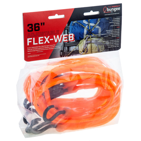 The orange Flex-Web Bungee Cargo Net is the most universal and easiest cargo net to use. It has 6 straps with hooks and can be fully expanded to cover an area of 3.65m x 3.65m (144"x 144"). The net is easy to use and tangle-free. Each arm can be independently sized for the application. The net is made of durable, all-weather materials that are resistant to sun, cold, fuels, chemicals, and saltwater. It can safely stretch up to 2x its original length. Each arm of the net requires 46 Joules/34ft lbs of force to reach 2x stretch. Order your Flex-Web Bungee Cargo Net today for your truck bed, rooftop, hitch mount carrier, 4x4, or SUV.