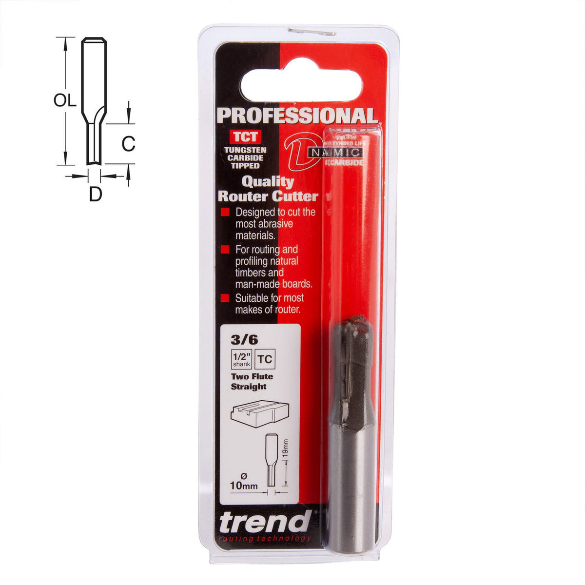The Trend 3/6X1/2TC TCT router cutters are perfect for use on abrasive materials such as chipboard, MDF & plywood. The two flutes give a clean finish to cut edges and the tungsten carbide tips ensure long life and maximum durability.